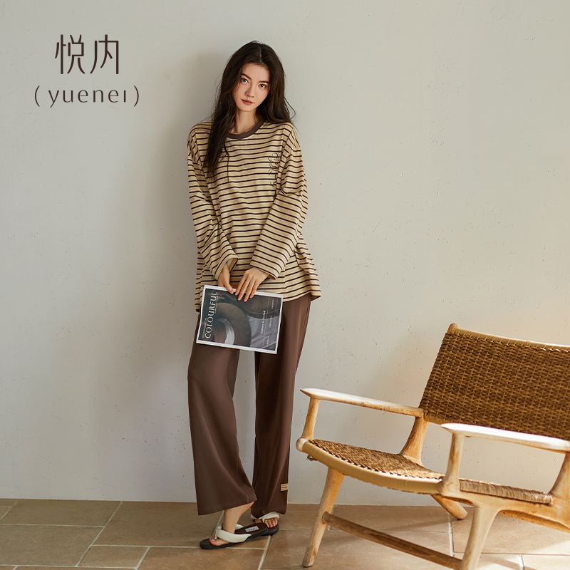 家居服时尚 秋天纯棉长袖 休闲条纹可外穿 春秋季 悦内带胸垫睡衣女款