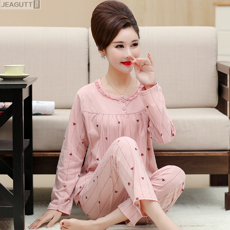 套头老年家居服套装 妈妈加大码 纯棉睡衣春秋季 带胸垫中年女士长袖