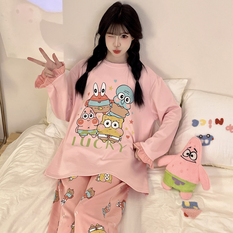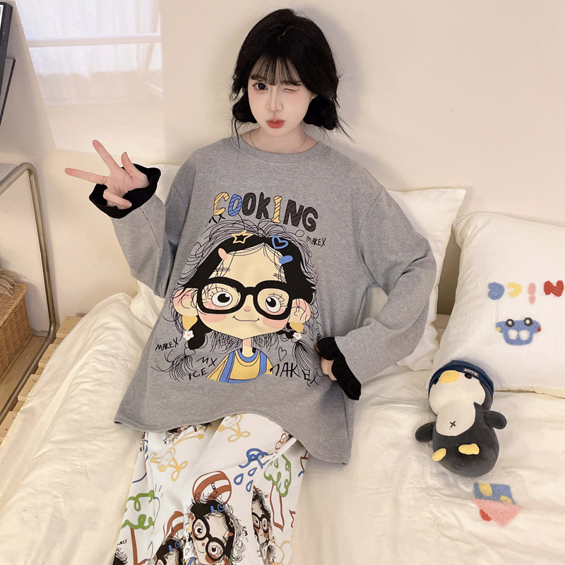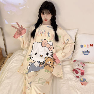2025新款 可爱卡通休闲家居服套装 春秋季 长裤 纯棉长袖 猫人睡衣女款