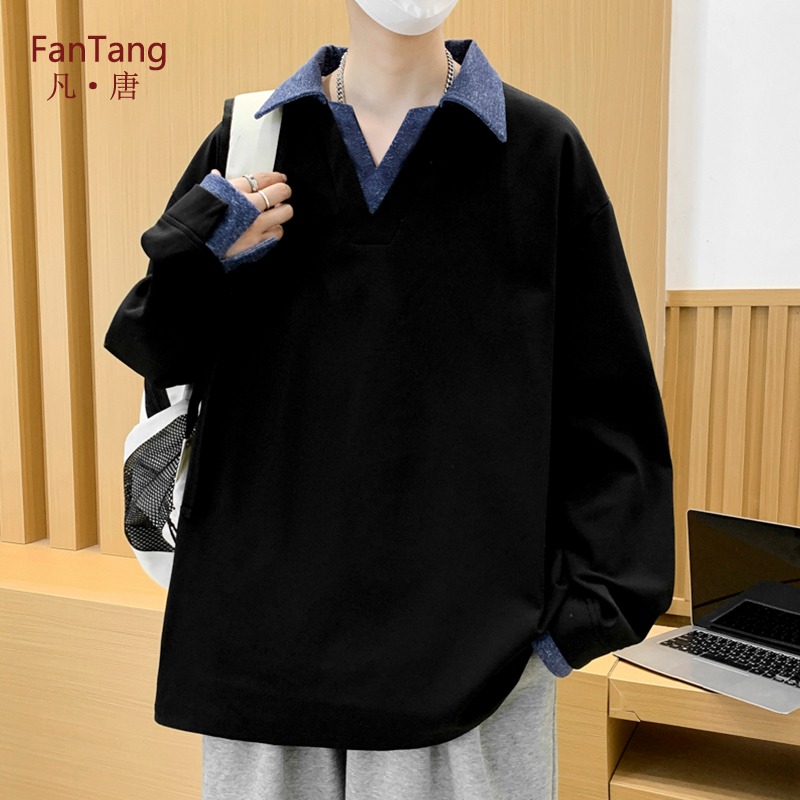 潮牌宽松外套 高街百搭情侣帽衫 V37美式 假俩件深V领连帽卫衣男秋季