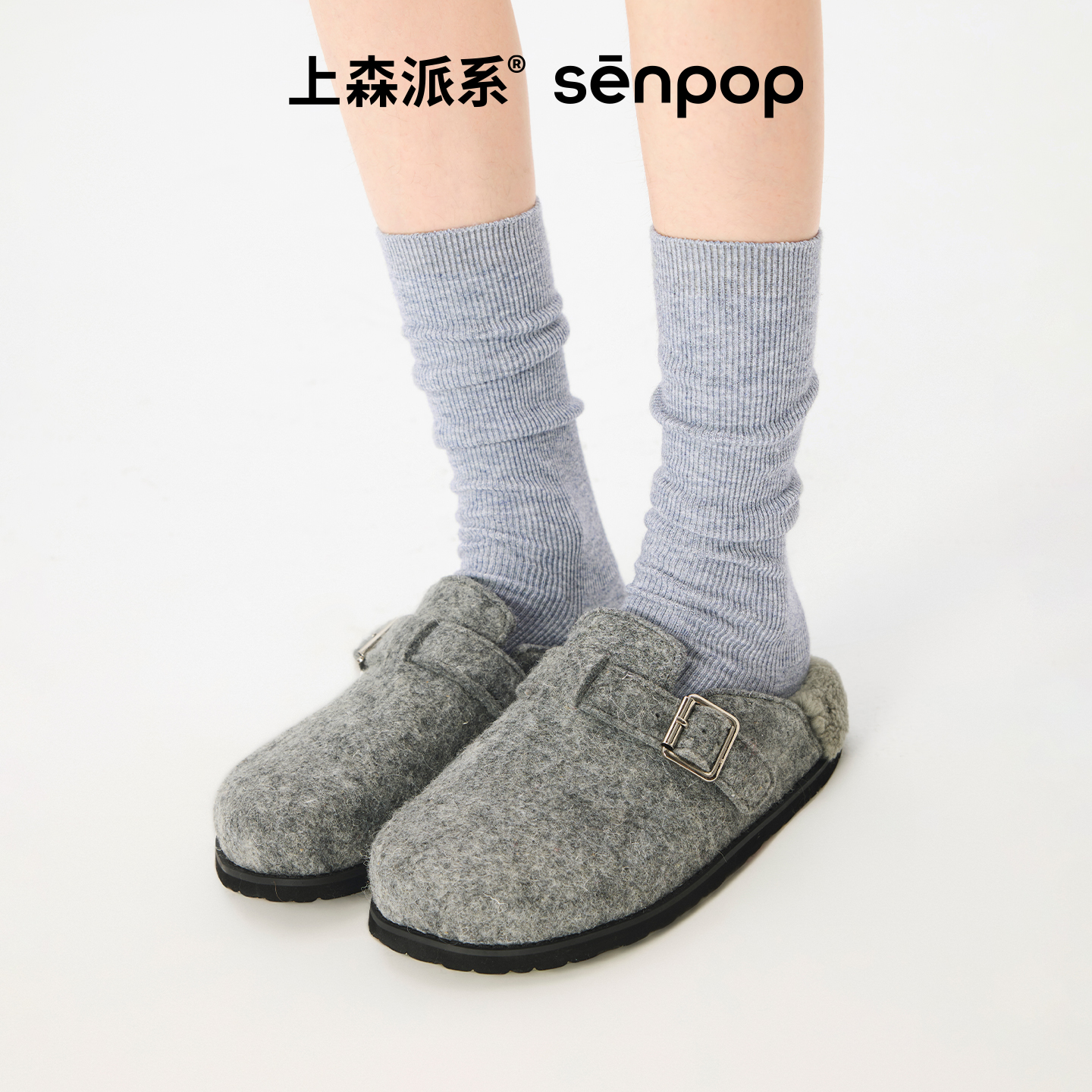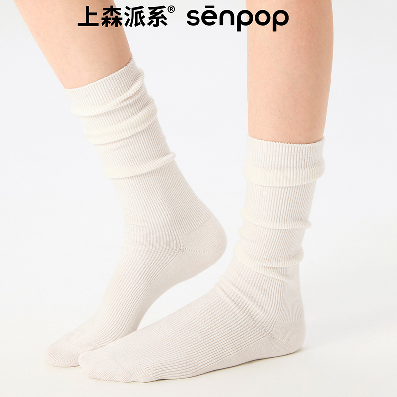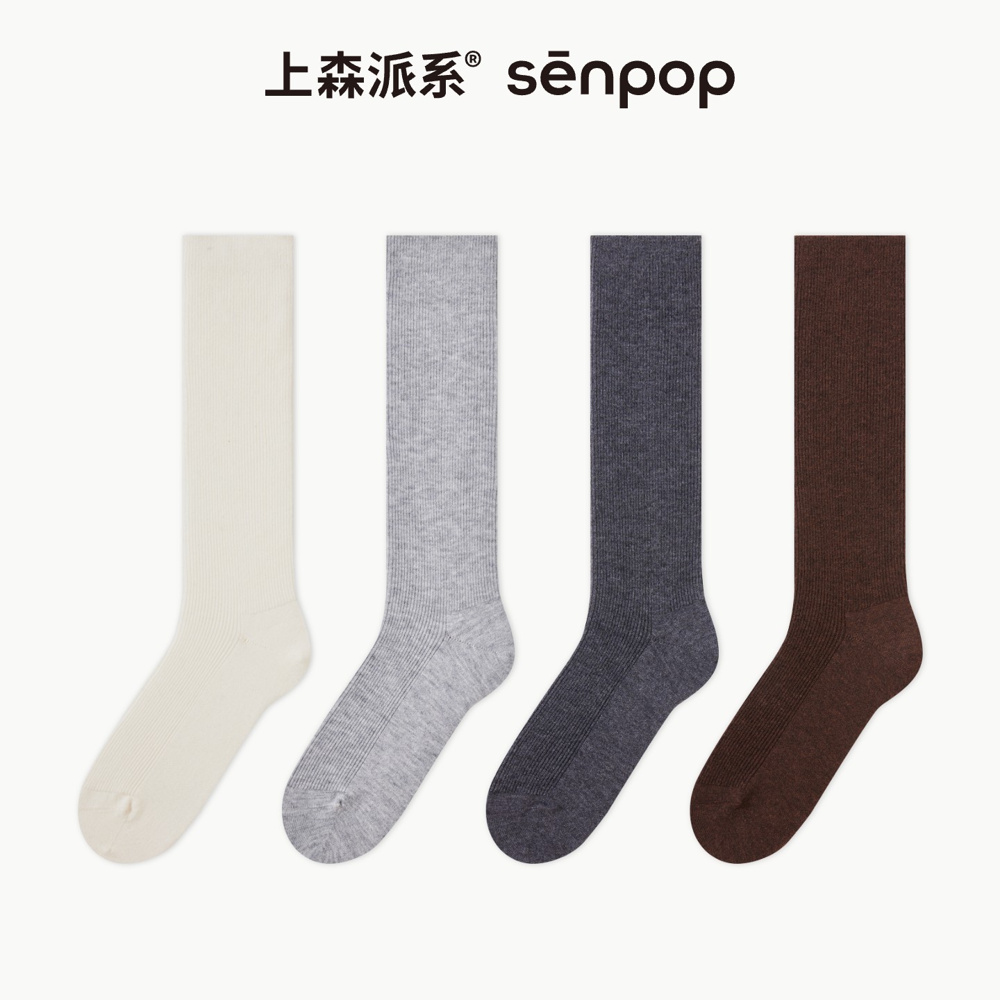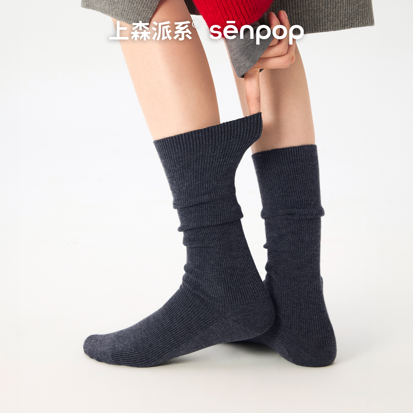 上森棕色羊毛堆堆袜子女秋冬款 棉袜 中筒袜显瘦小腿袜竖条纹配皮鞋