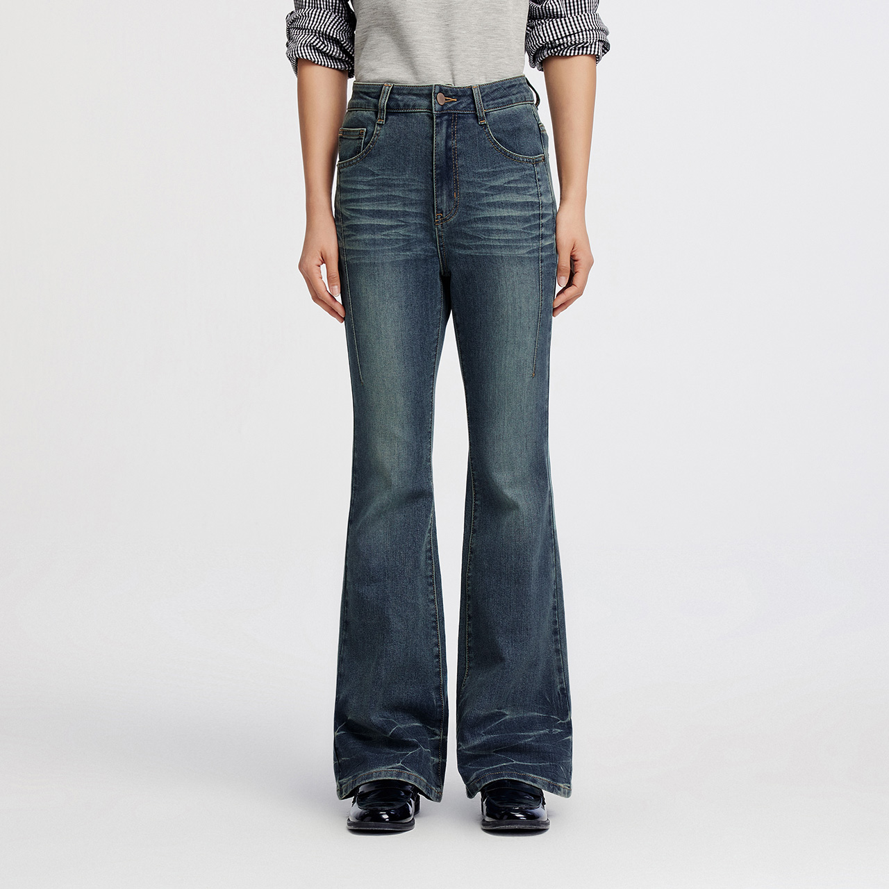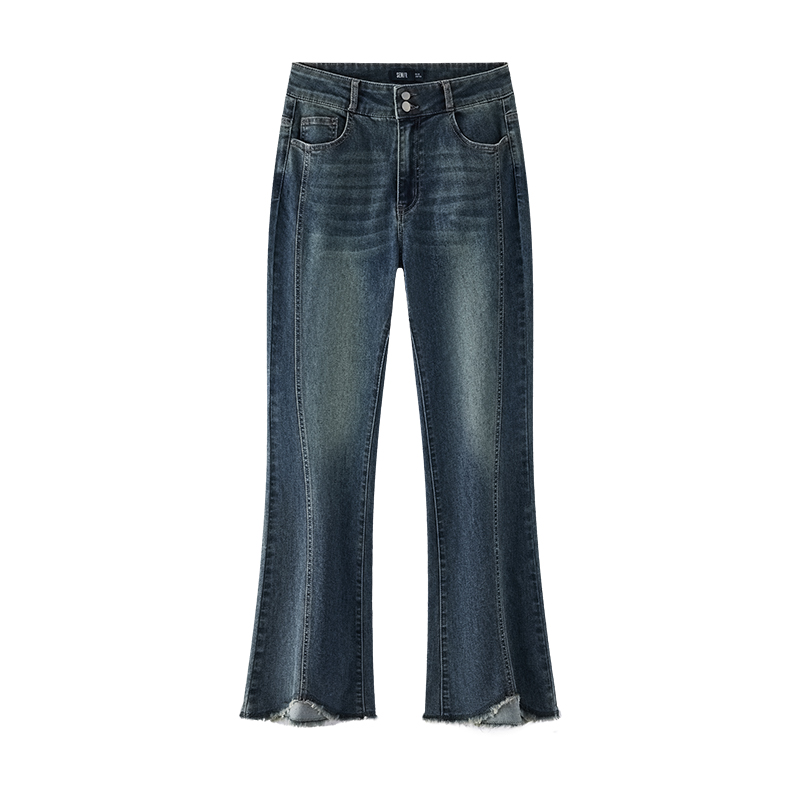 女高腰显瘦宽松加绒气质喇叭裤 复古蓝微喇阔腿牛仔裤 新款 乔栈秋季