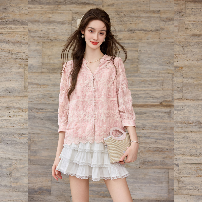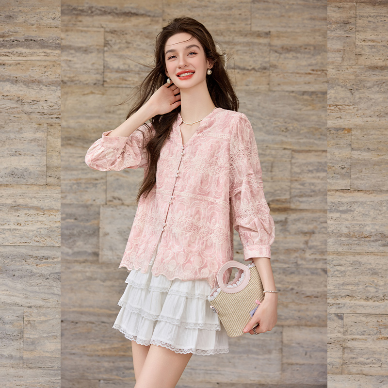 设计感浪漫V领九分袖 25早秋新款 气质上衣 复古绣花衬衫 白鹿语法式