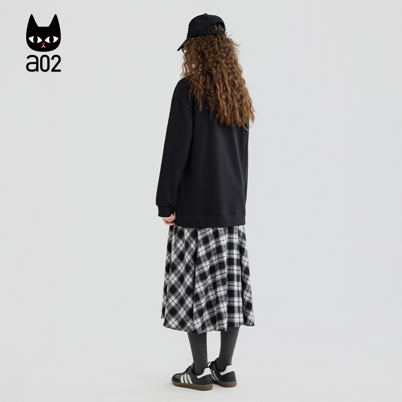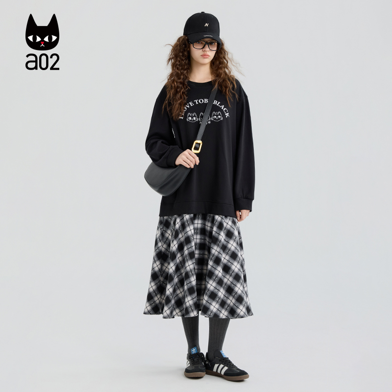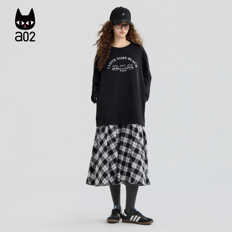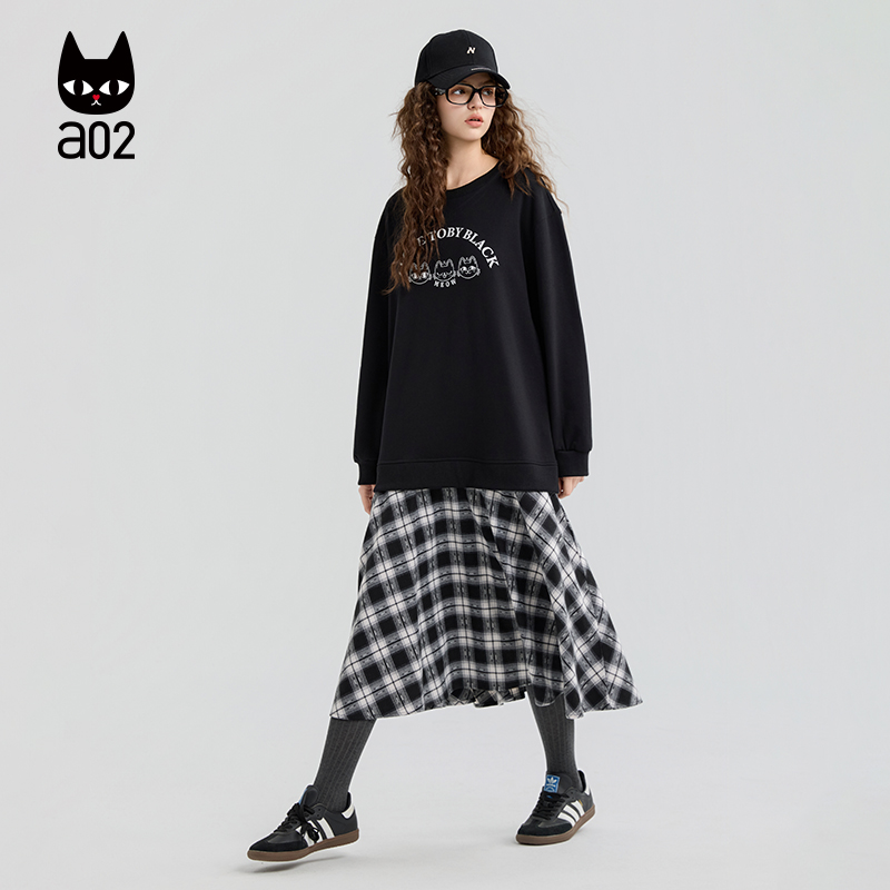 a02黑猫系列黑色假两件连衣裙女2025新款 宽松设计感卫衣裙子 秋季