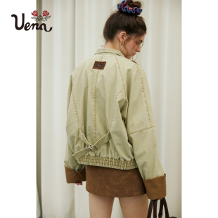 水洗做旧工装 Uena抹茶绿分割设计皮革翻边袖 外套女 奇幻绘画家