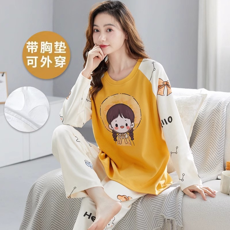 长裤 长袖 秋冬季 透气家居服春秋款 自带胸垫一体式 女士套装 睡衣女款