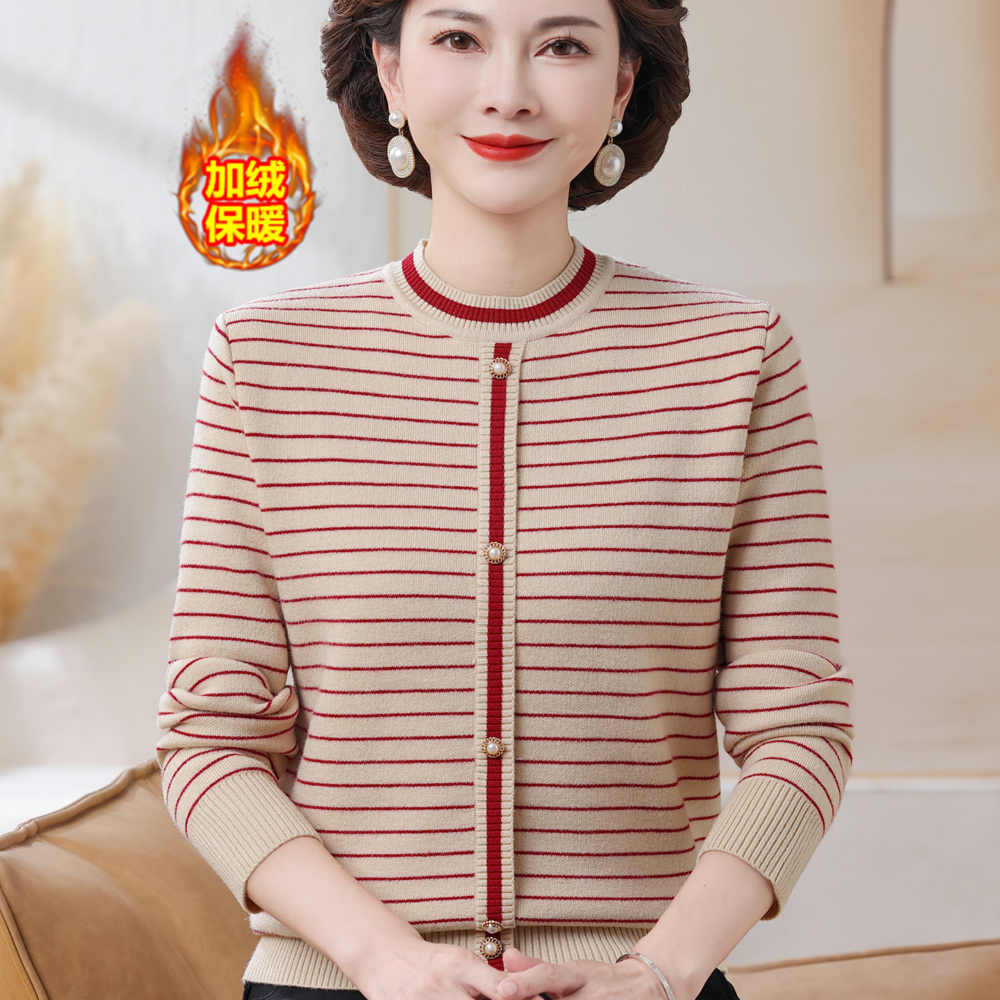 妈妈装 条纹加绒针织保暖上衣中年女士半高领一体绒毛衣两件套 冬季