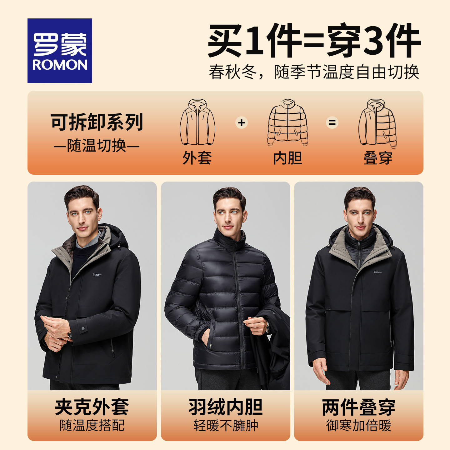 许亚军同款 新款 罗蒙男士 连帽羽绒服2025冬季 可拆内胆外套 短款