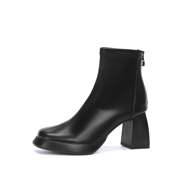 法式 加绒白色瘦瘦靴子女 粗跟方头高跟马丁短靴厚底小个子增高新款