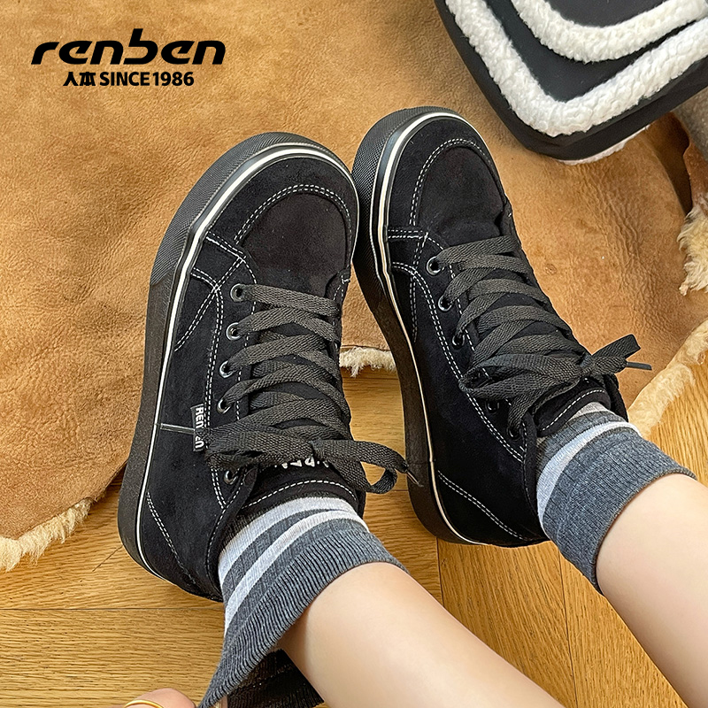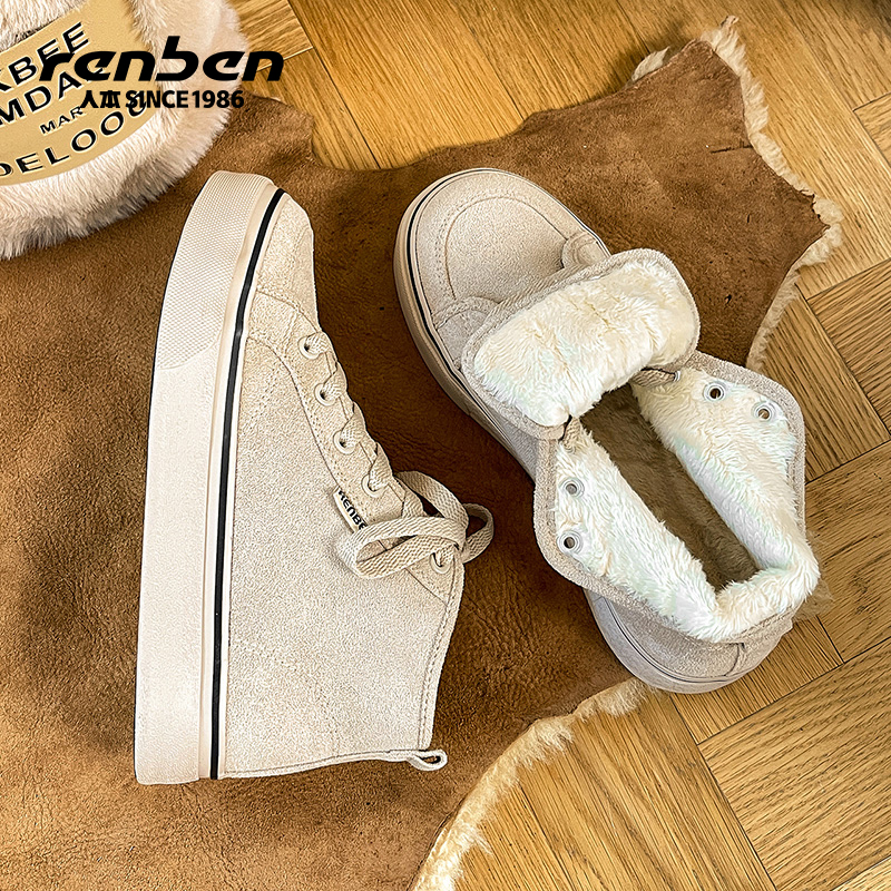 学生百搭运动板鞋 厚底休闲保暖棉鞋 秋冬季 人本加绒短靴女2025新款
