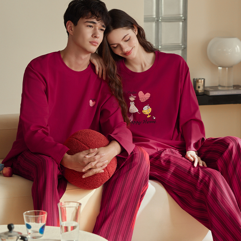 新婚喜庆枣红色家居服男女套装 纯棉长袖 情侣睡衣秋冬季 LYCRA莱卡