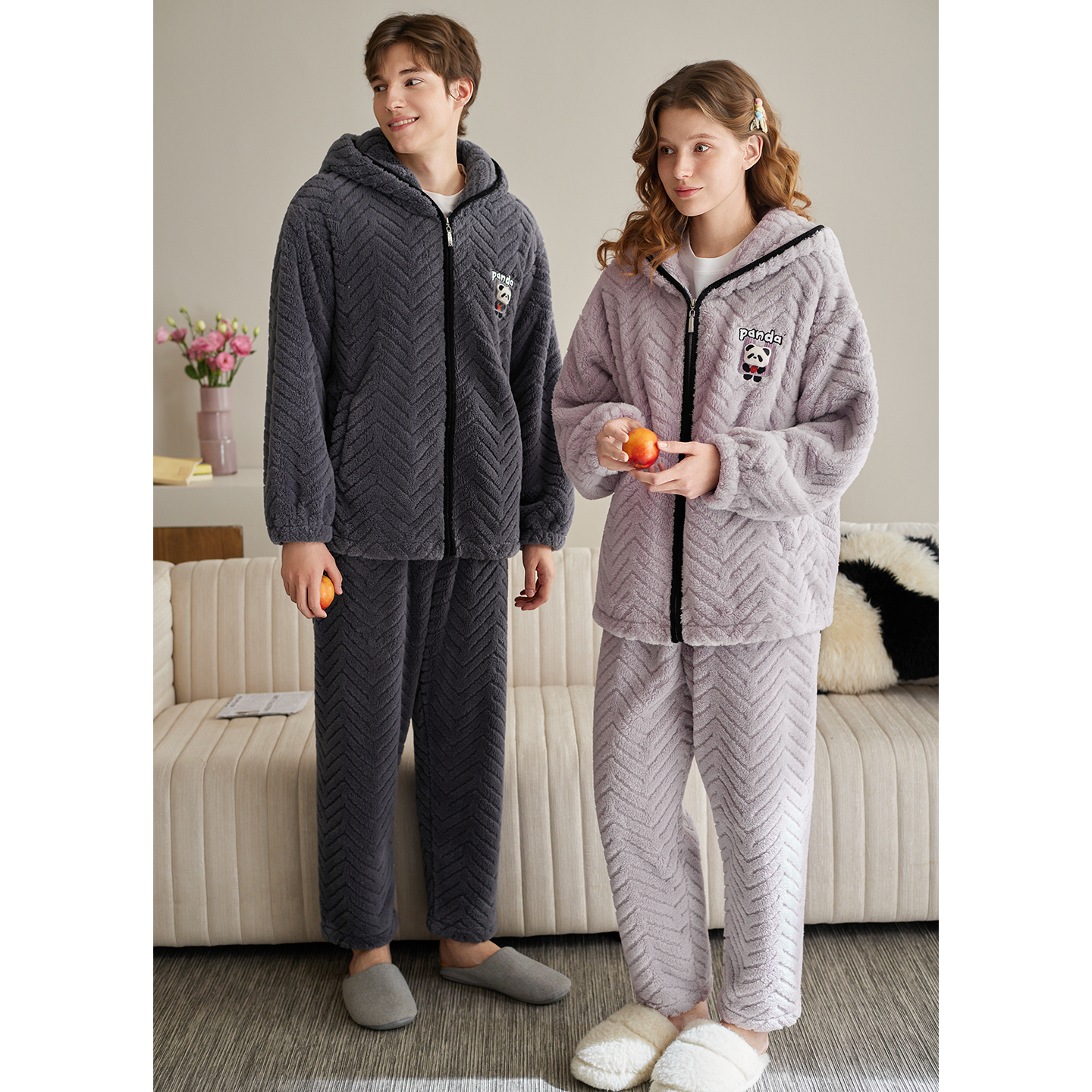 红豆珊瑚绒睡衣冬季 情侣抗菌防静电男女士加绒加厚保暖家居服套装