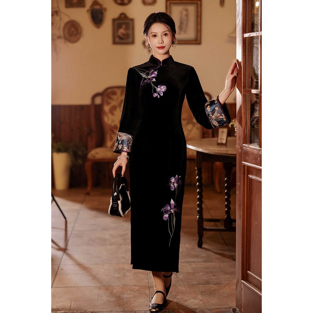 黑色丝绒鱼尾旗袍性感长款 连衣裙女秋 显瘦老上海中国风日常生活装