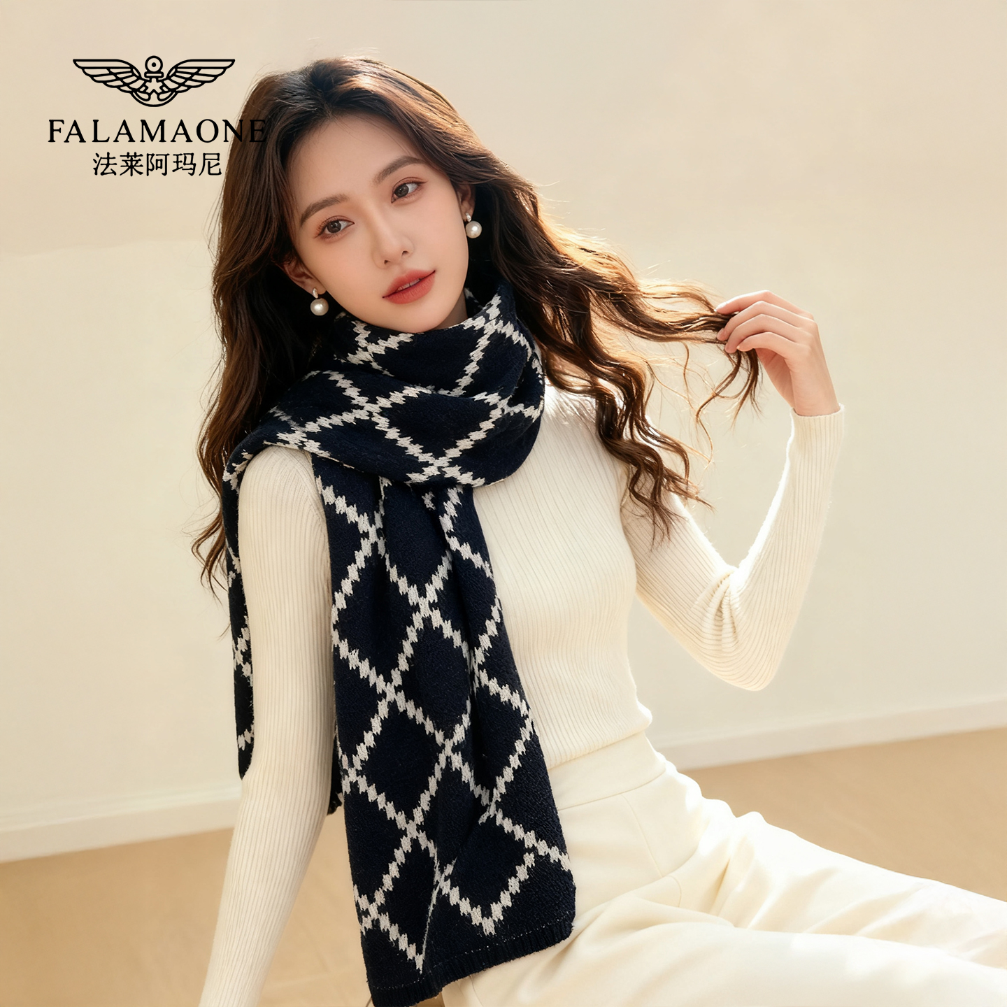 法莱阿玛尼菱形格纹黑色围巾2025新款 保暖围巾披肩两用 女秋冬时尚