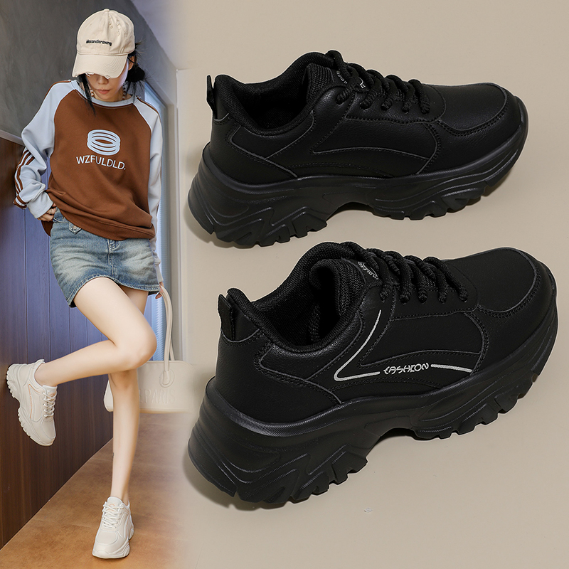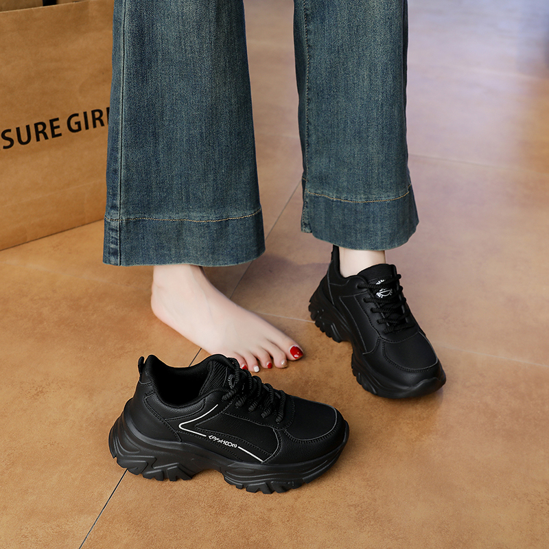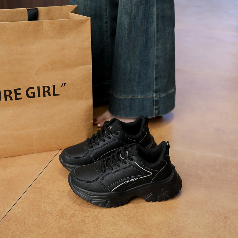 软底不累脚上班皮面大码 女鞋 显脚小防滑黑色运动鞋 厚底老爹鞋 秋季