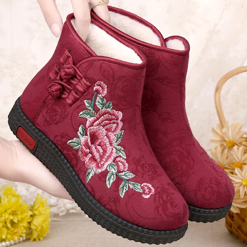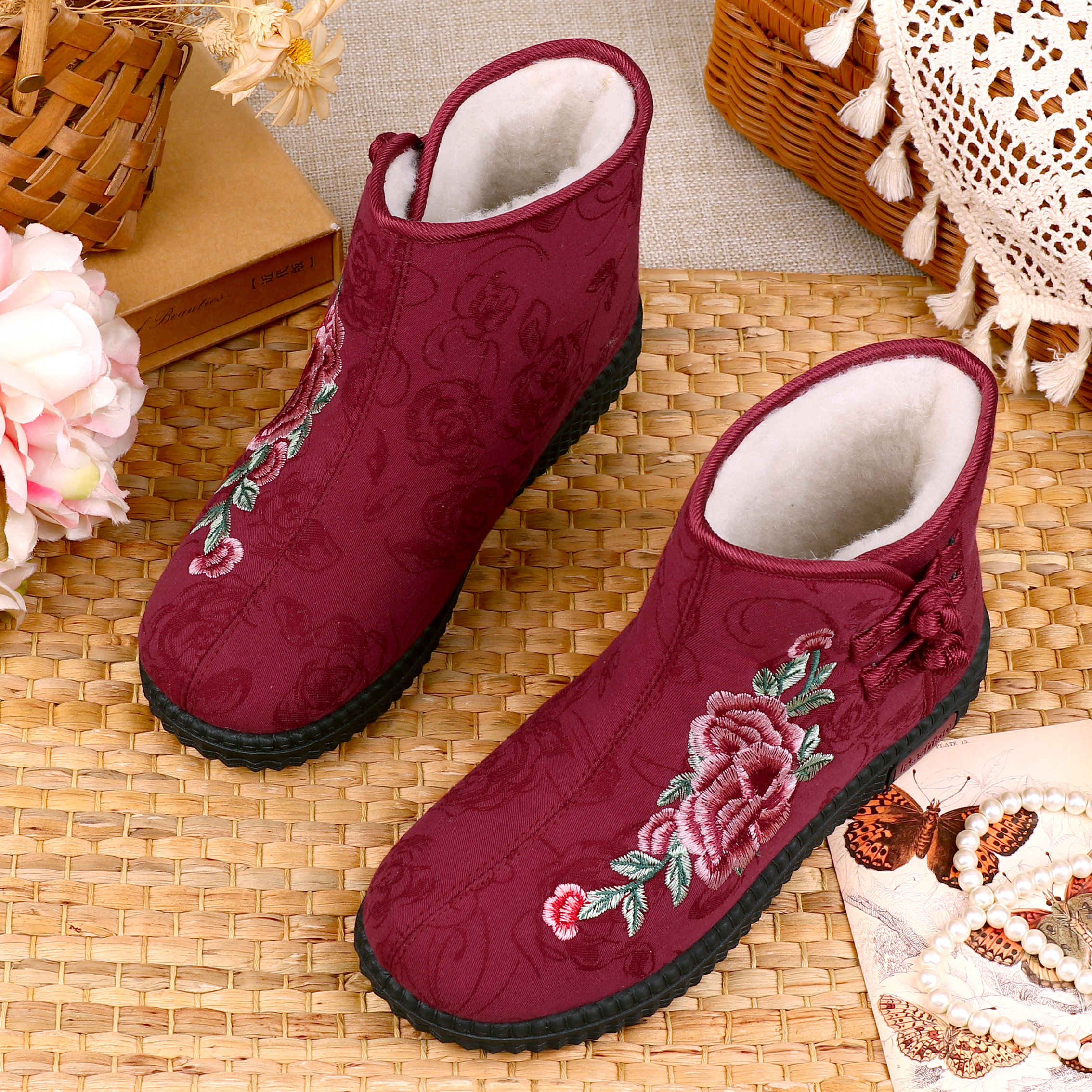 防滑中老年妈妈棉鞋 老北京布鞋 女冬加绒加厚保暖短靴民族风绣花鞋