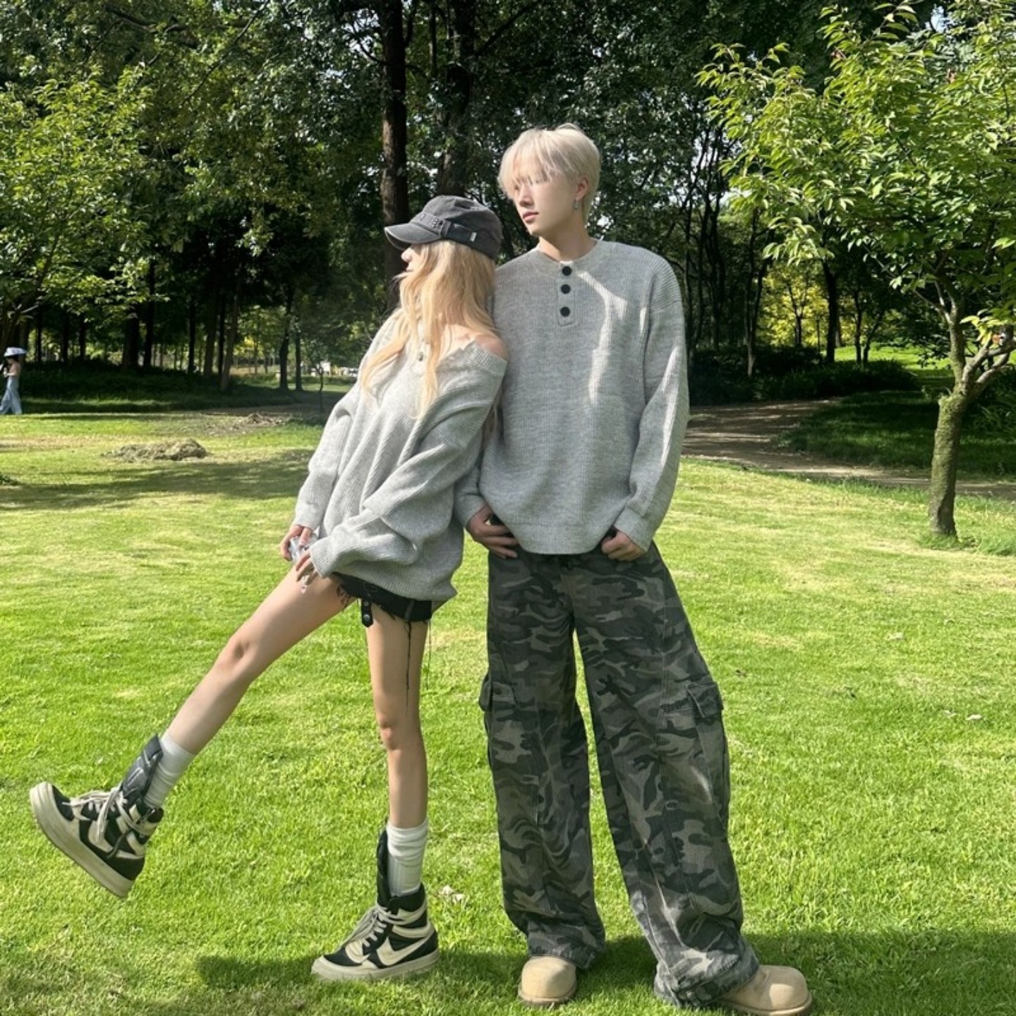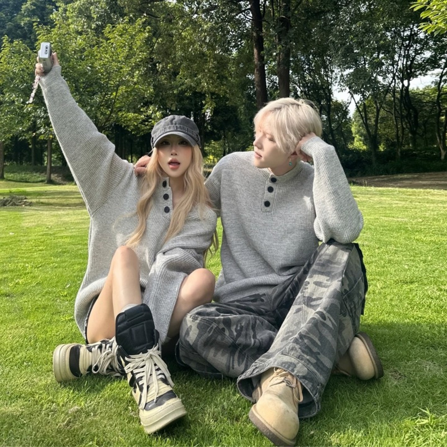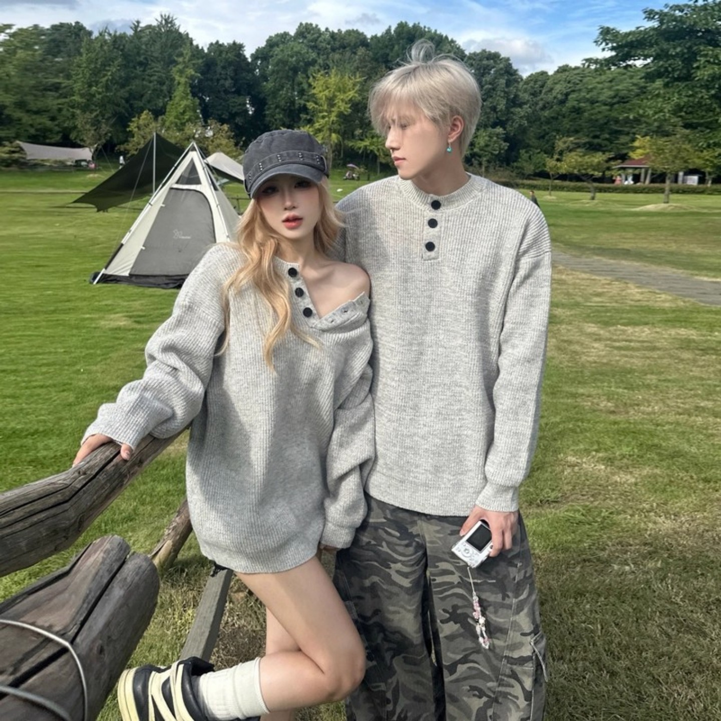 圆领内搭打底衫 亨利领针织衫 毛衣男女秋冬季 灰色慵懒高级感情侣装