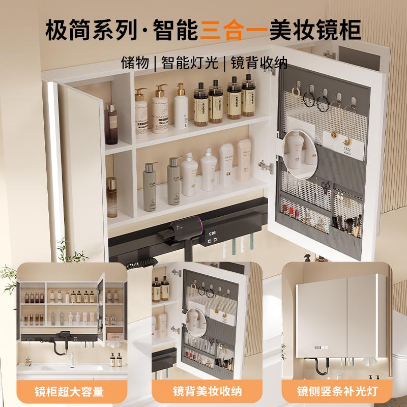多功能浴室智能镜柜单独挂墙式 带灯除雾卫生间吹风机美妆镜子实木