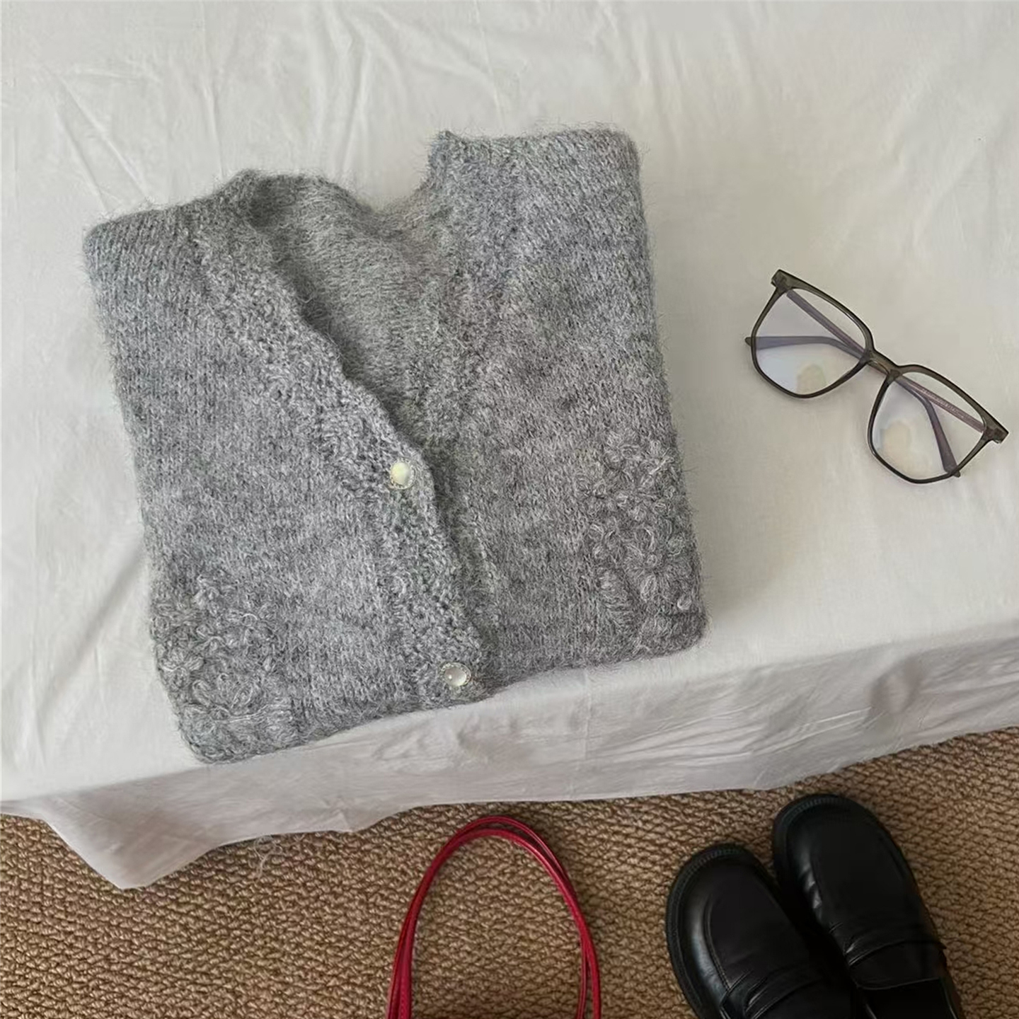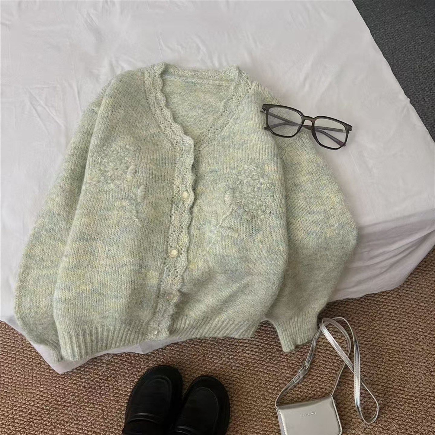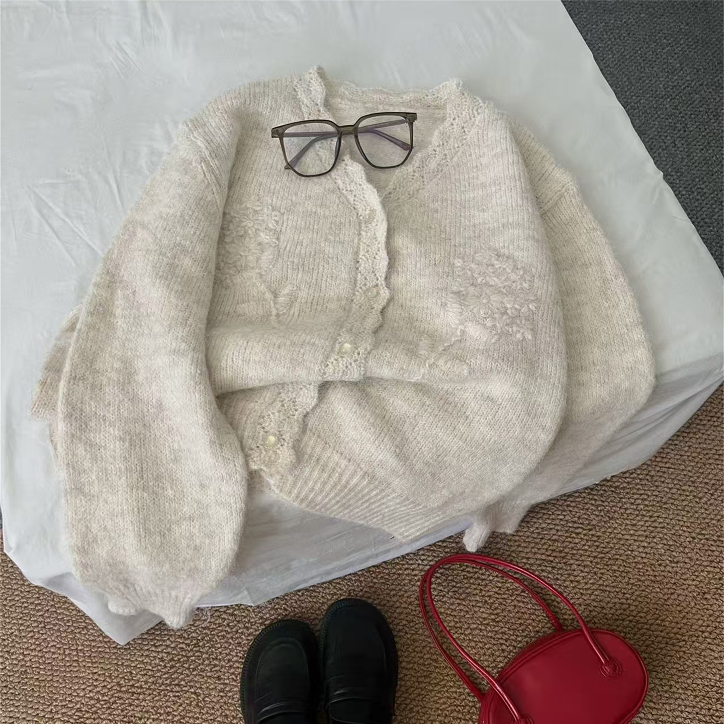 法式 花边V领针织上衣女气质温柔风2025年秋冬高级感绣花毛衣开衫
