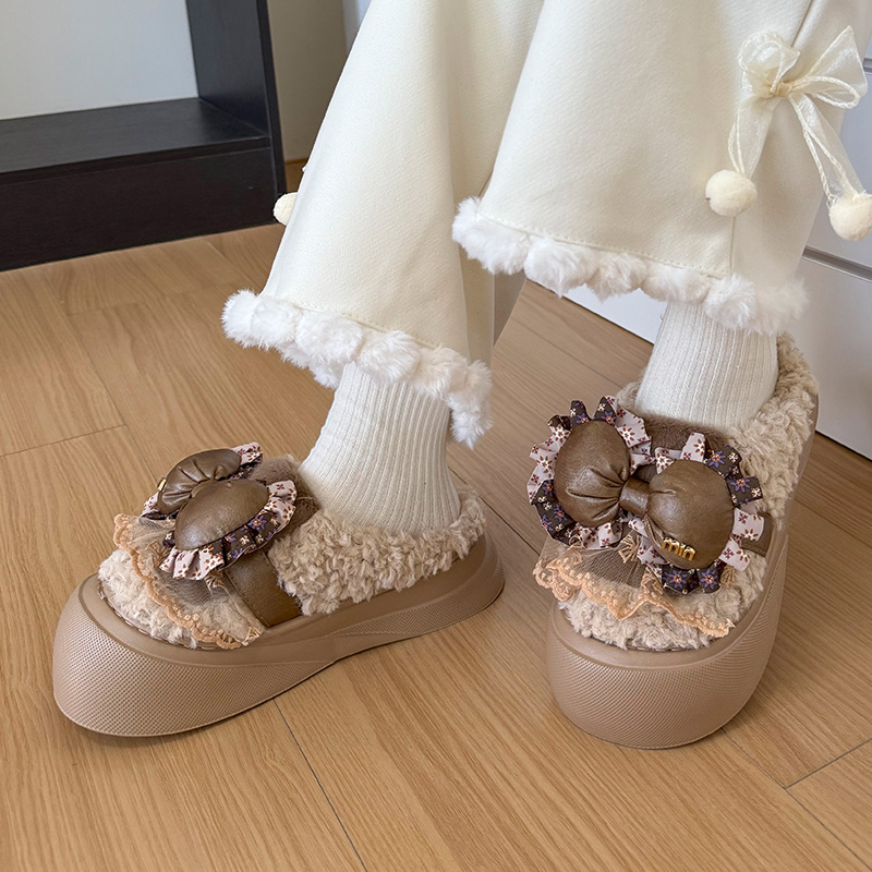 冬天公主 居家室内软底可爱蝴蝶结学生加绒毛毛拖鞋 棉拖鞋 女生冬季