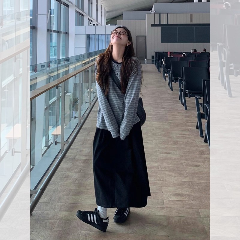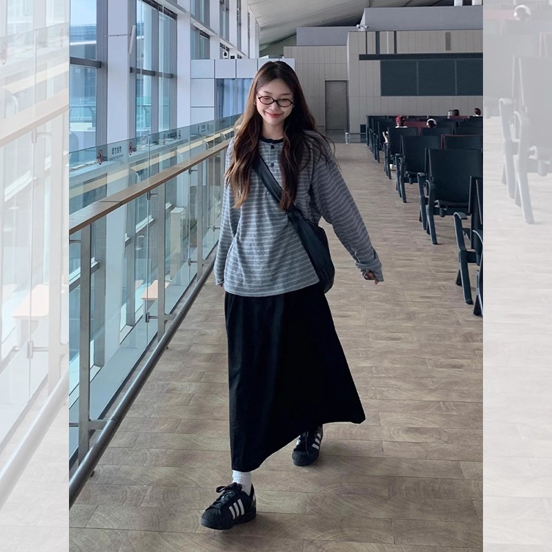 新款 2025新款 T恤女秋季 复古条纹亨利领长袖 百搭慵懒宽松上衣 韩版
