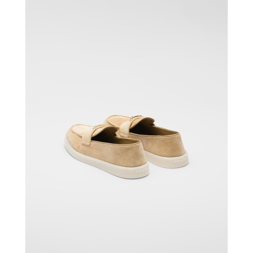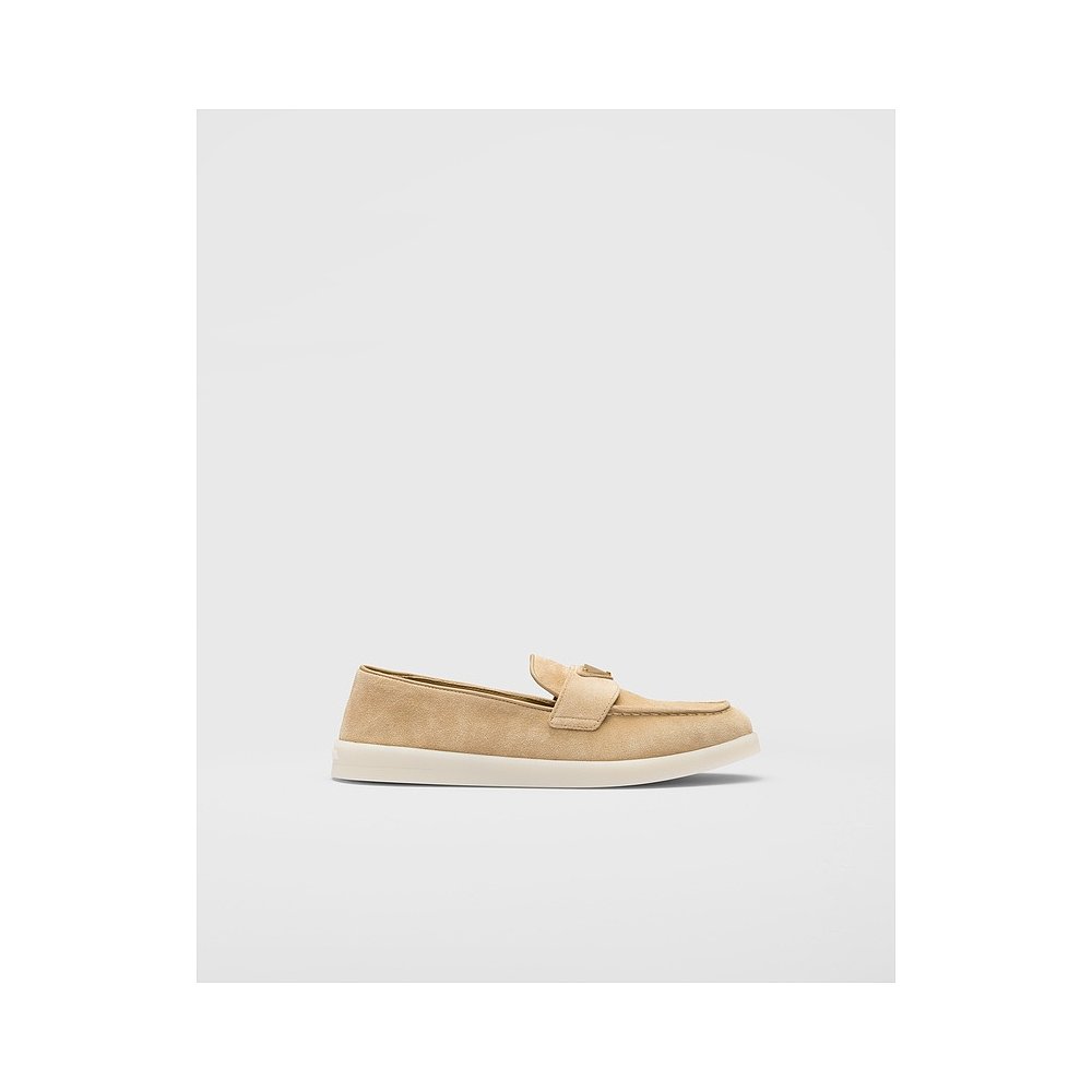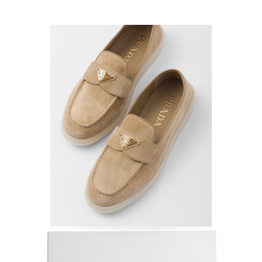 自营欧洲直邮Prada普拉达 女士米黄色小牛皮金属三角标识莫卡辛鞋