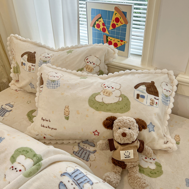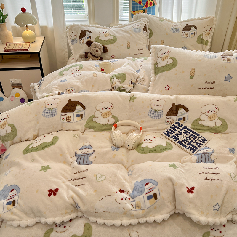 秋冬a类牛奶绒四件套卡通珊瑚绒被套毛绒球花边流苏款 高级感轻奢