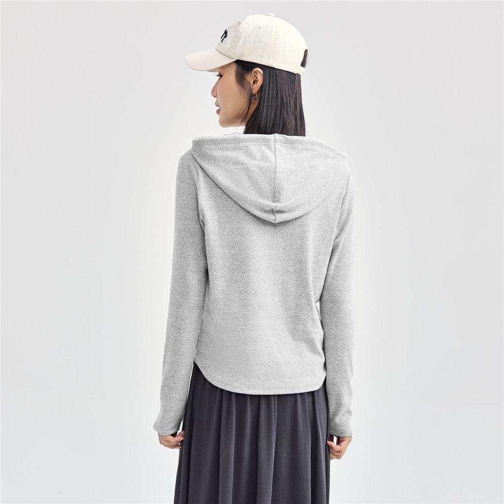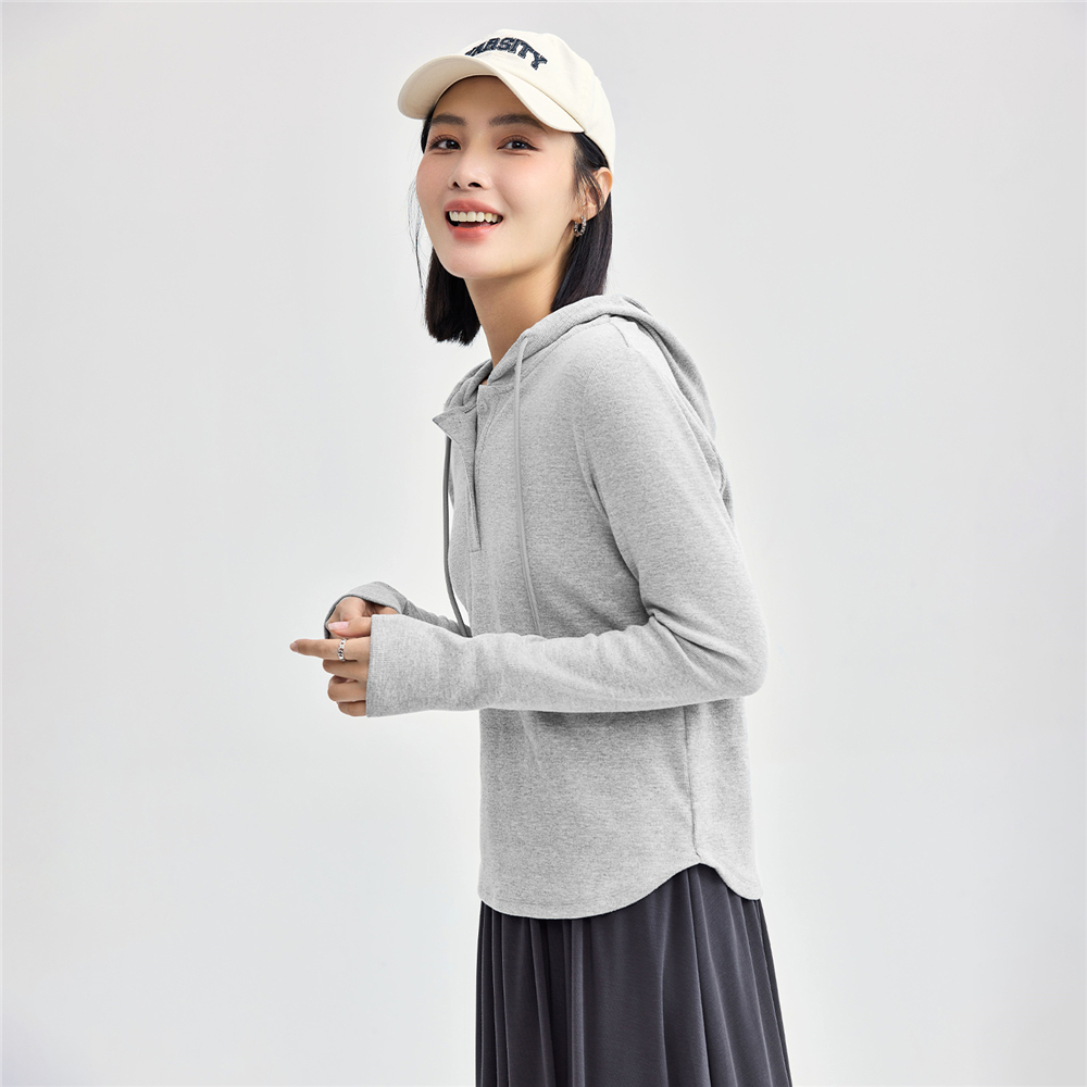 05325813 弧形下摆连帽针织衫 佐丹奴长袖 T恤女弹力细坑条针织t恤衫