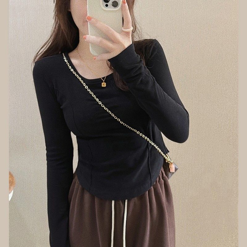 打底衫 长袖 女最新 春秋冬U领露锁骨别致短款 纯欲上衣女 款 鱼骨修身