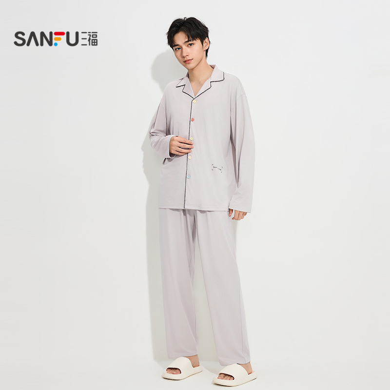 舒适宽松长袖 三福男士 基础棉莫翻领睡衣套装 新款 家居服504731 秋季