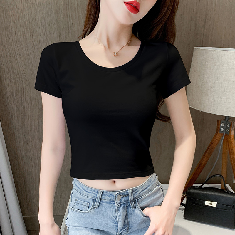 新款 纯棉露脐t恤女白色短袖 显瘦体恤2025夏季 上衣高腰修身 潮 短款