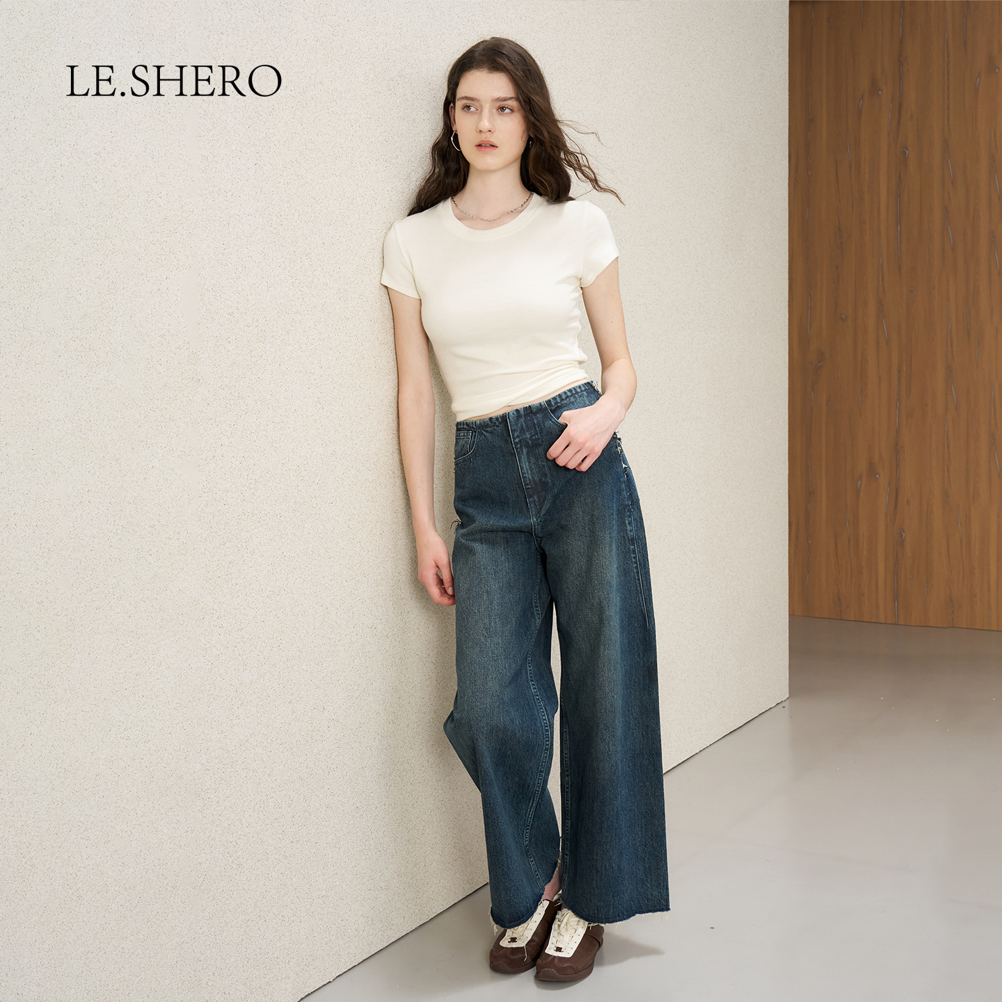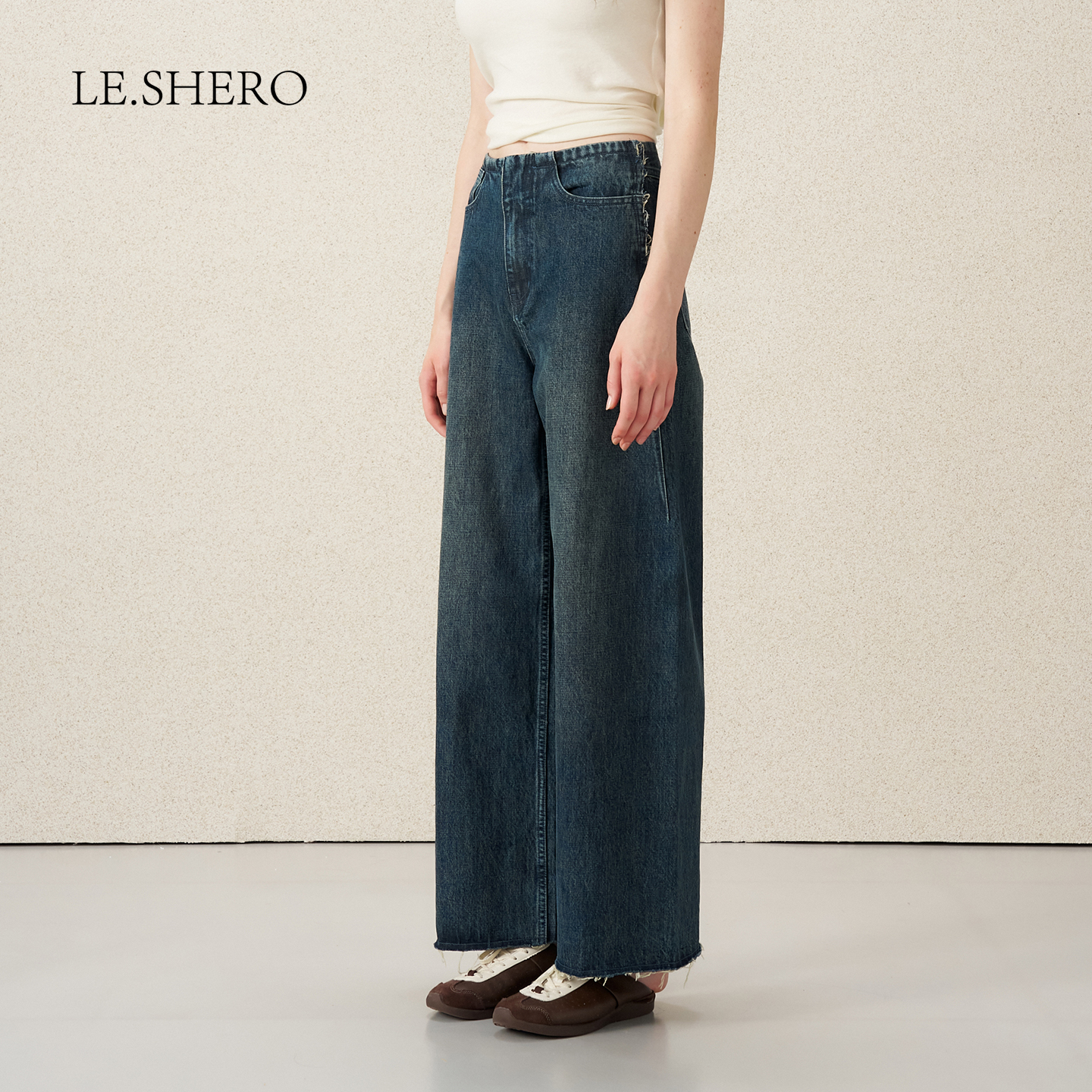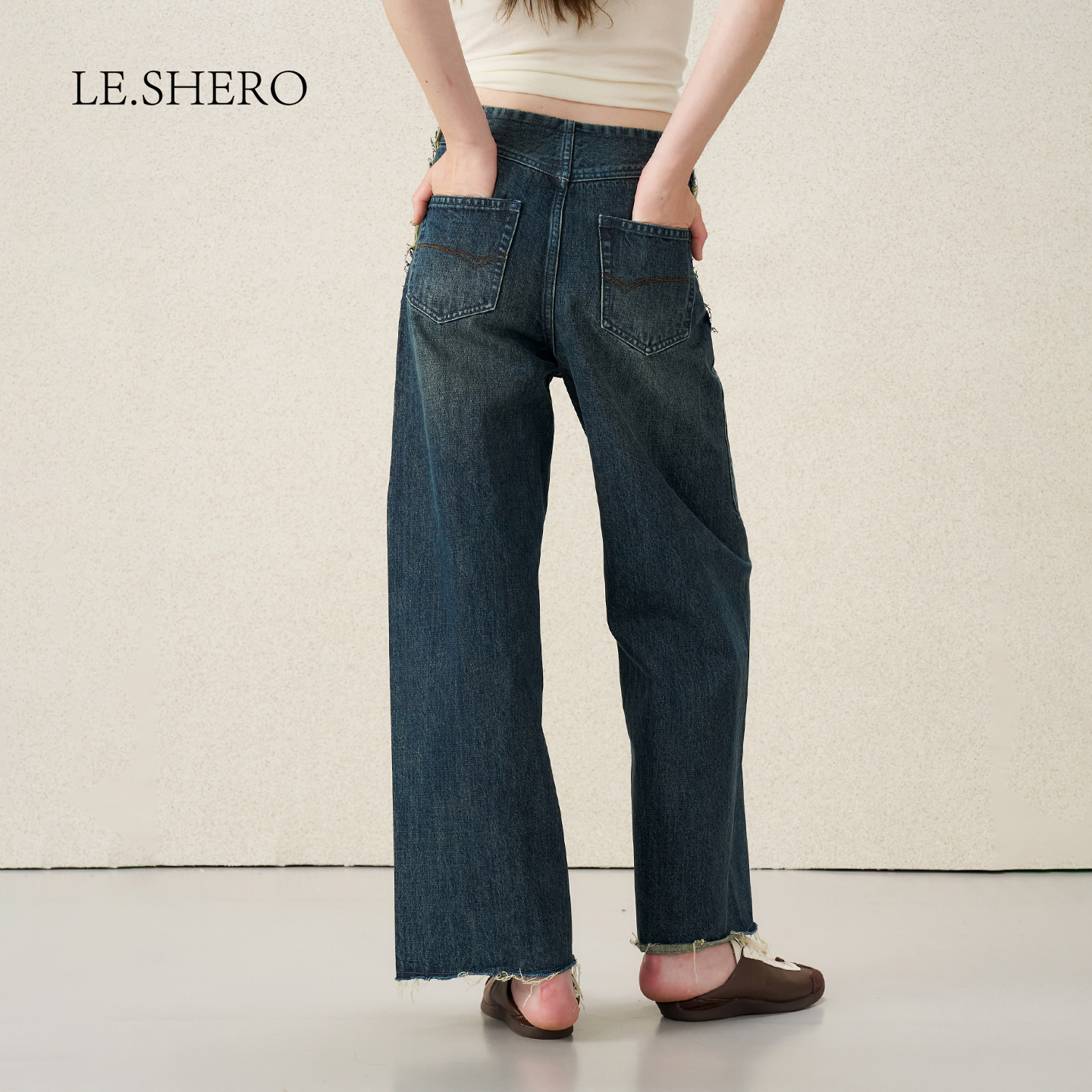 LE.SHERO简约休闲百搭纯棉复古中腰宽腿牛仔长裤 蓝色直筒裤