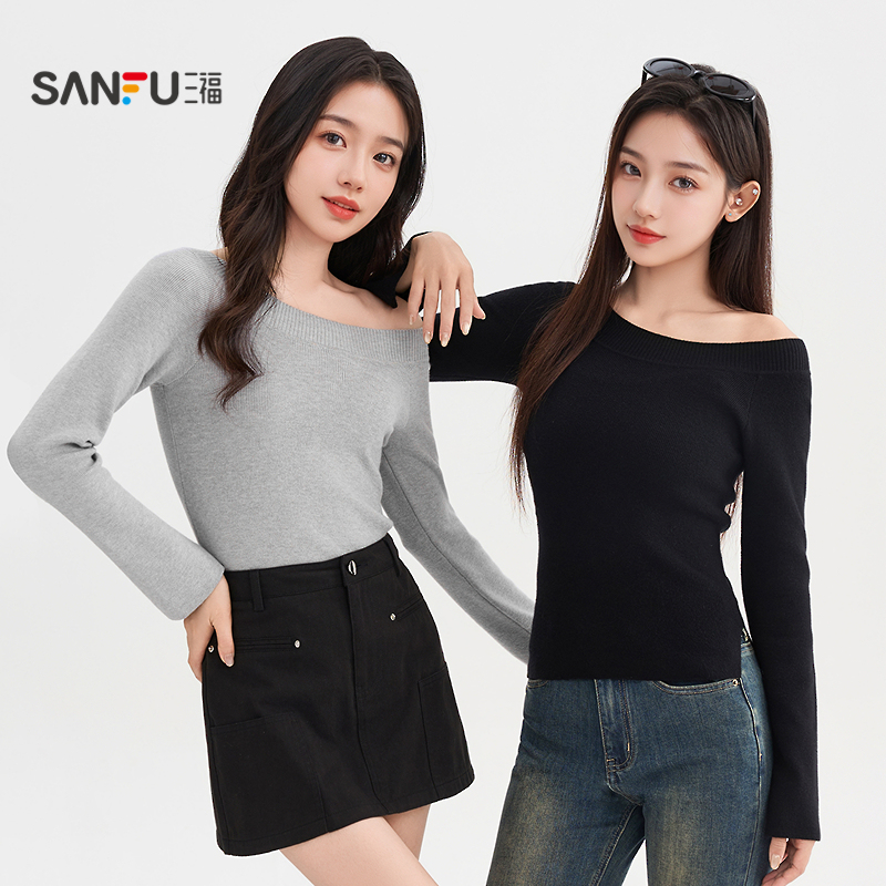 上衣女装 子单侧开叉下摆修身 505628 喇叭袖 三福毛衣2025秋季