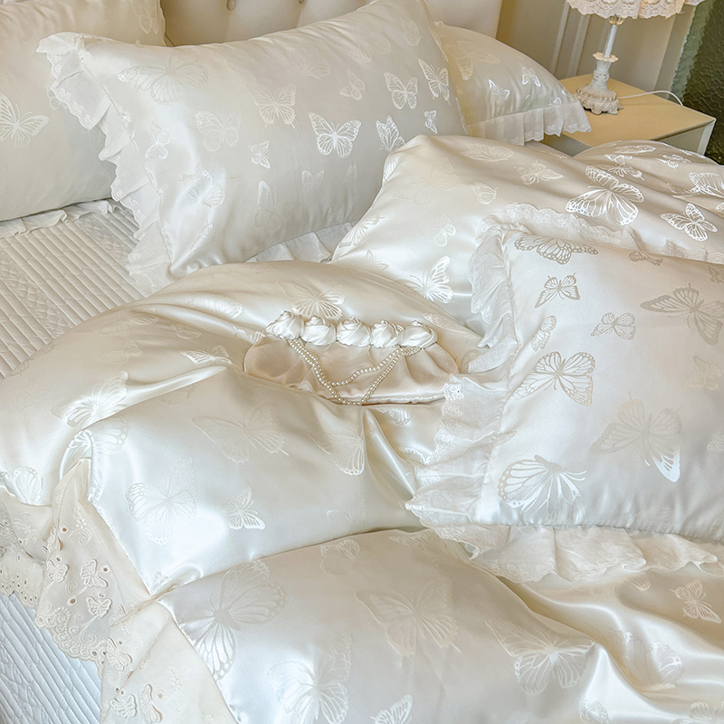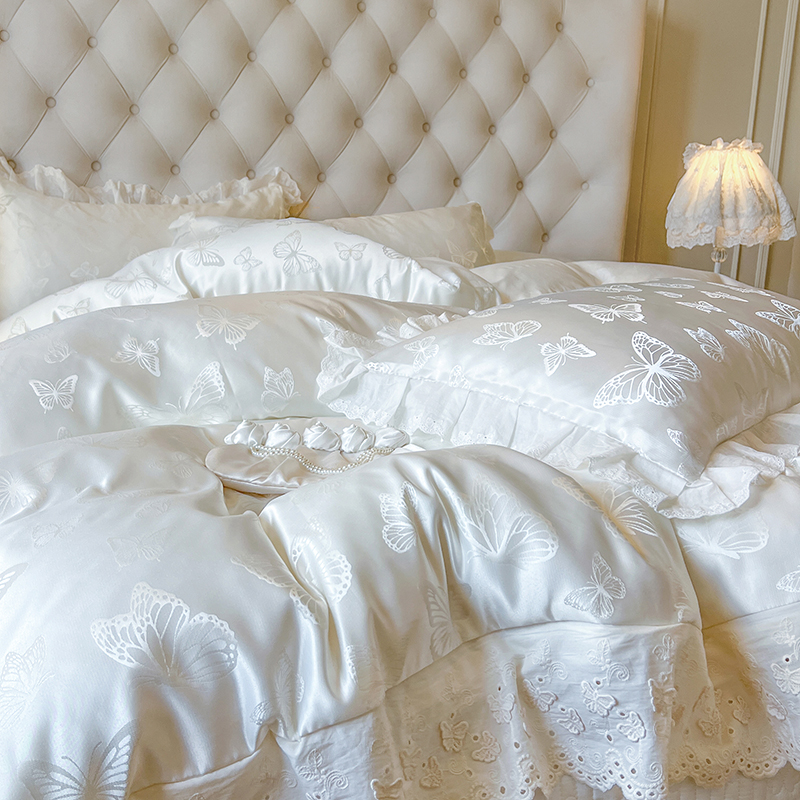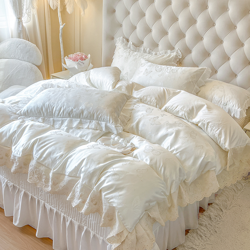 法式 纯棉少女心花边床品 花边贡缎提花床盖四件套公主风床裙款
