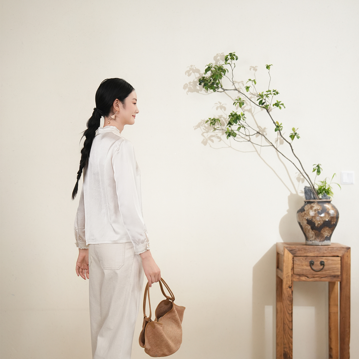 2025年秋H版 舒适女装 型通勤百搭款 长袖 时尚 布符木耳边珍珠扣衬衫