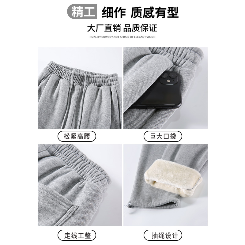 加绒街舞穿搭褶皱宽松休闲长裤 女秋冬季 子 灰色运动卫裤 自然涩美式