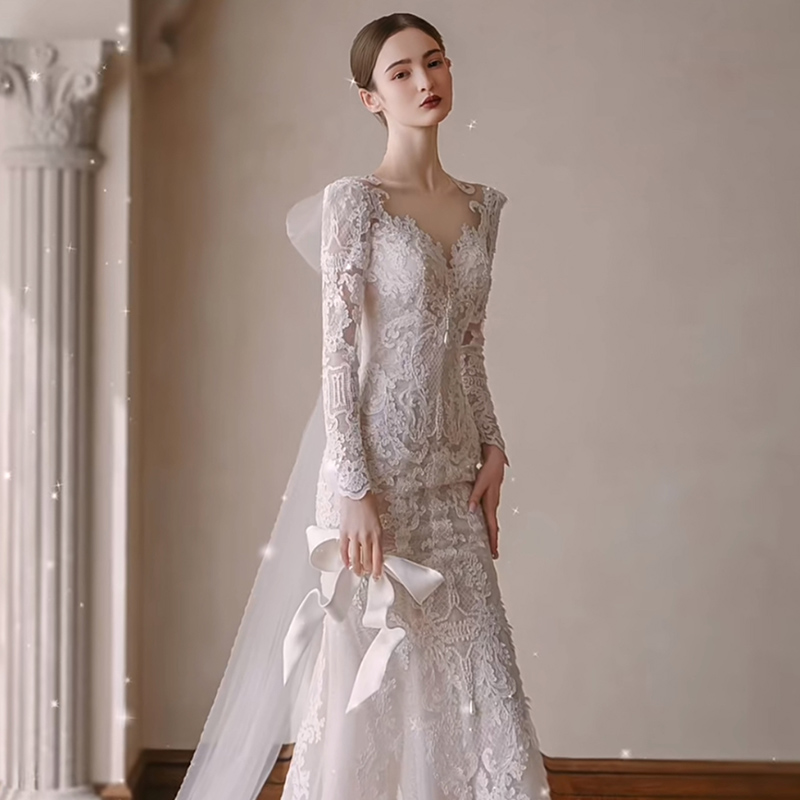 蕾丝鱼尾新娘结婚晚宴主持女裙婚纱修身 2025新款 裙 凡尔赛宫
