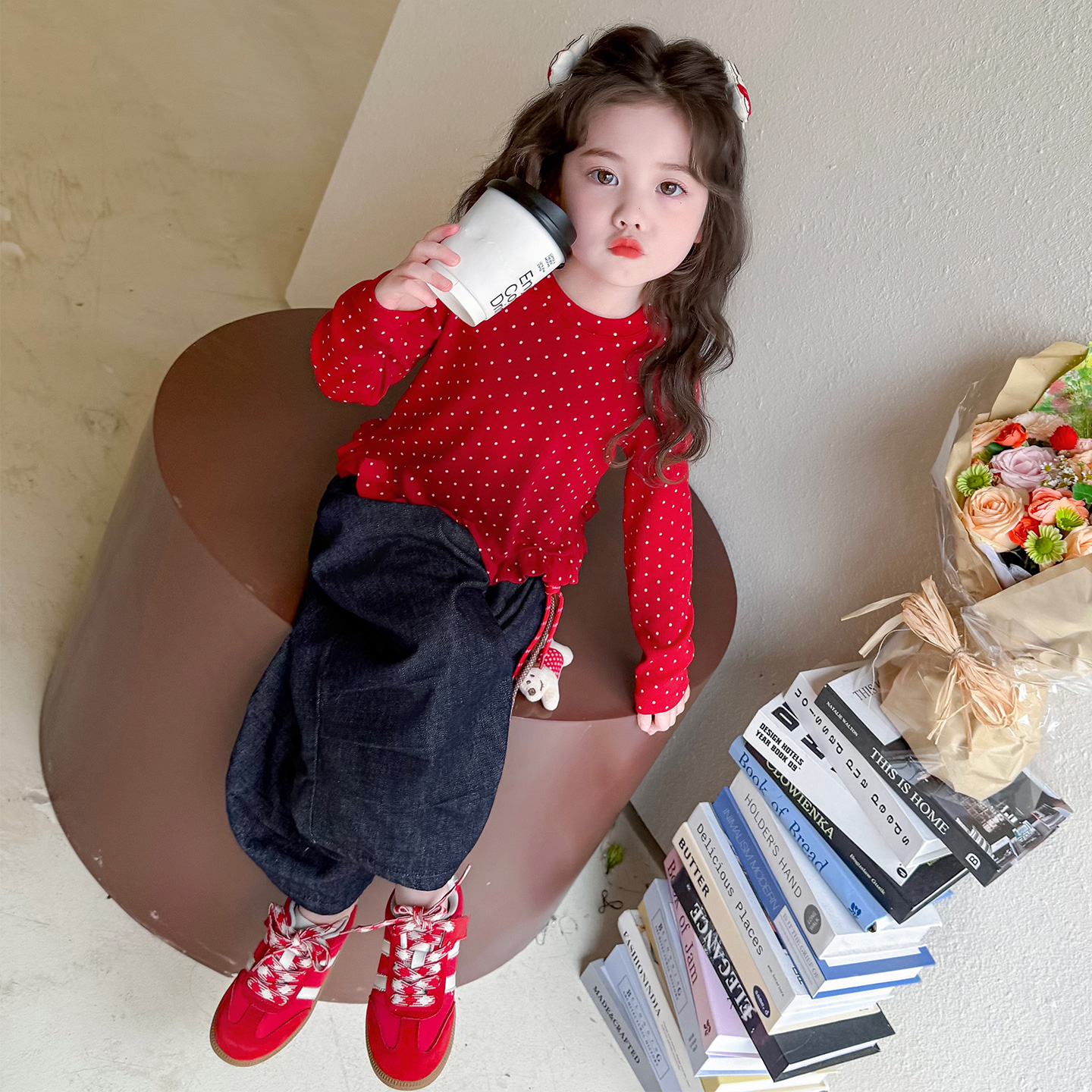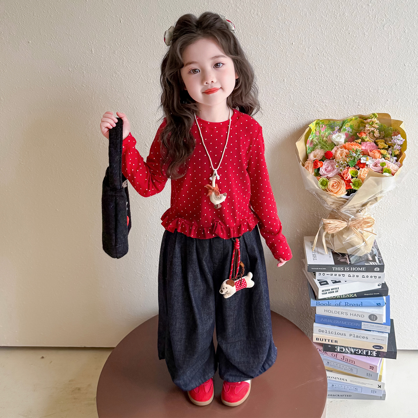 上衣牛仔裤 儿童春秋可爱波点长袖 女宝宝两件套潮 2025新款 女童套装
