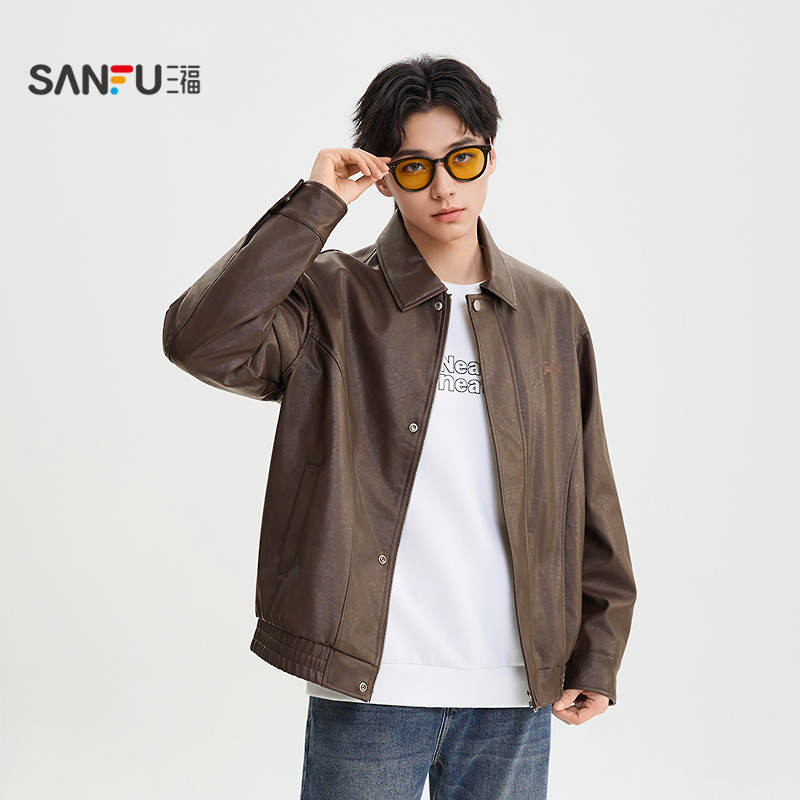 小个子翻领宽松夹克上衣女装 时尚 507135 秋季 三福皮衣外套2025新款