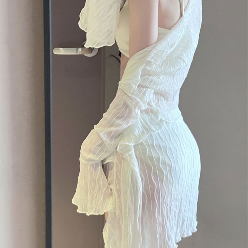 显瘦温泉装 蜜Dream纯欲辣妹比基尼泳衣女四件套分体长袖 保守裙式
