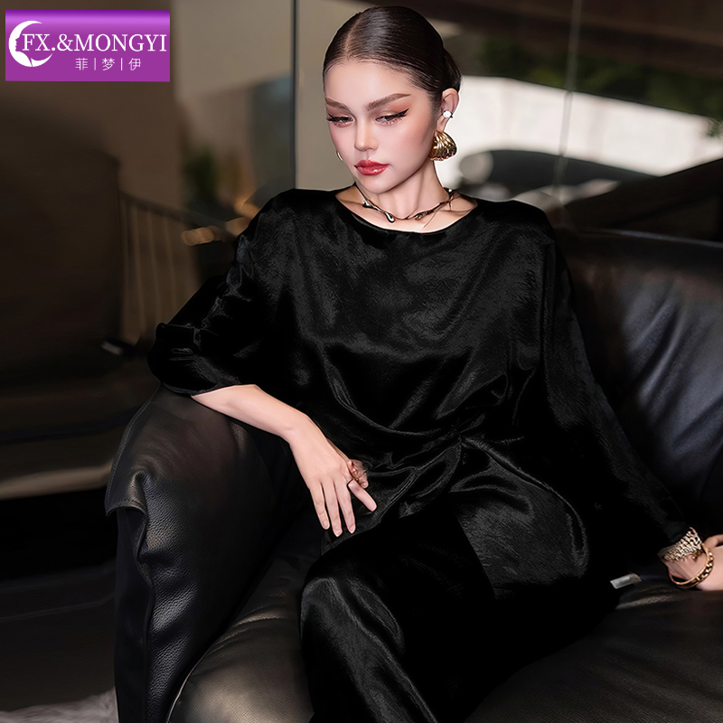 轻奢设计感褶皱上衣高腰阔腿裤 女秋季 两件套 套装 菲梦伊三醋酸时尚