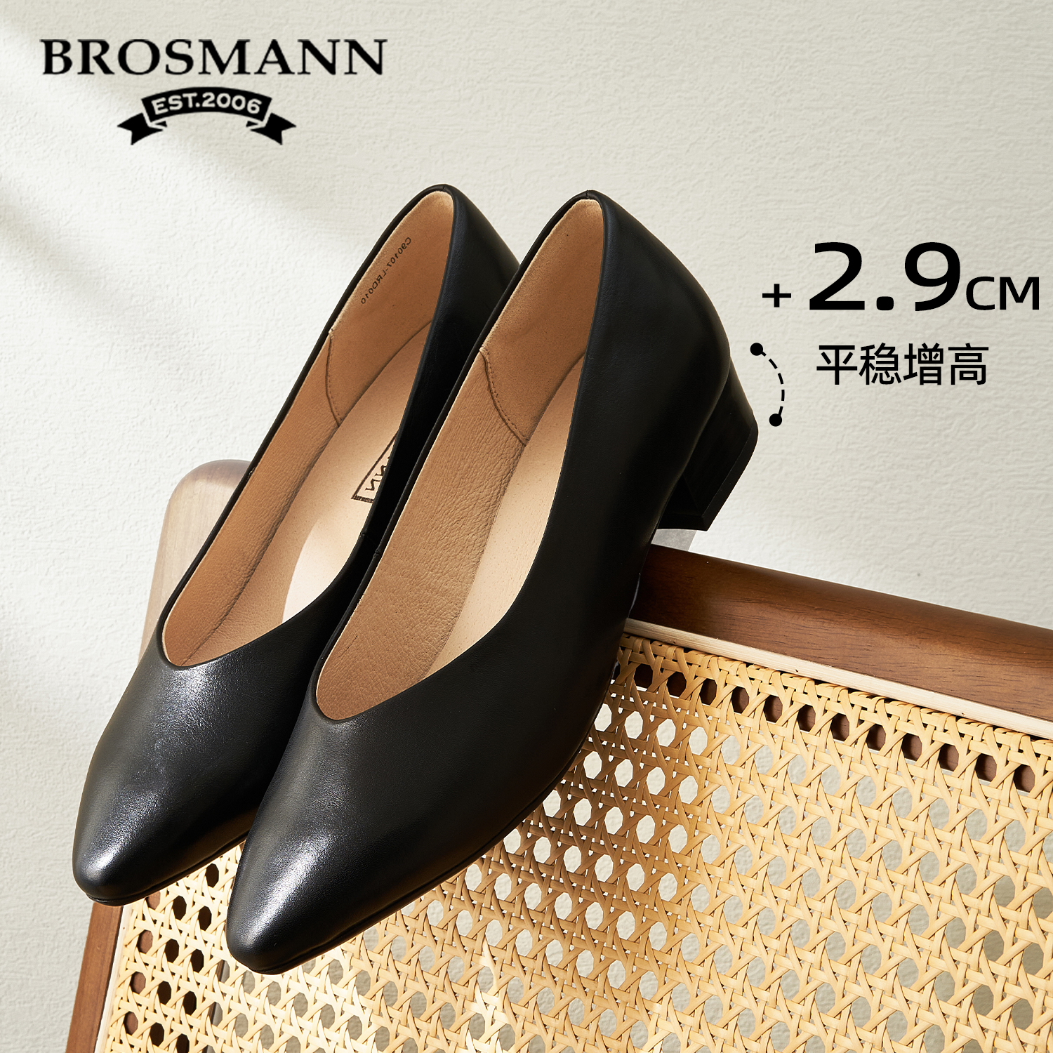 鞋 舒适静音乳胶垫通勤新款 宝舒曼头层牛皮透气粗跟单鞋 BROSMANN