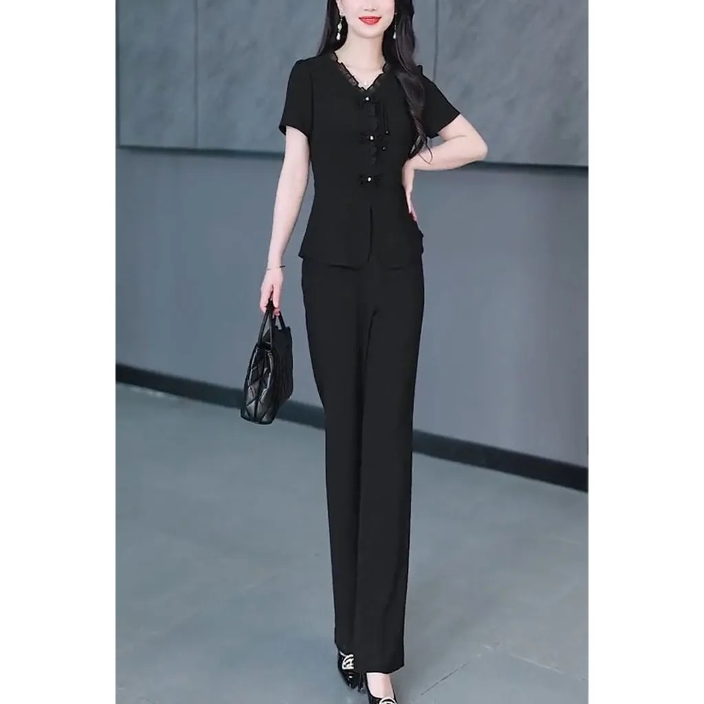 新款 女气质显瘦国风盘扣上衣微喇叭裤 时尚 套装 两件套 短袖 2025夏季