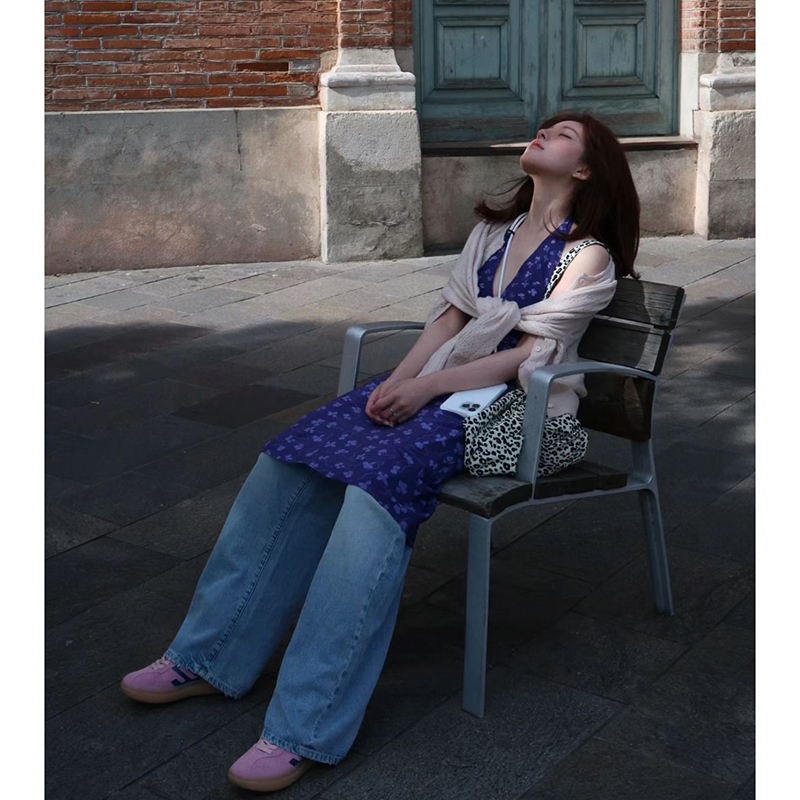 裙子叠穿牛仔裤 V领中长款 紫色印花挂脖吊带连衣裙夏季 赵露思同款