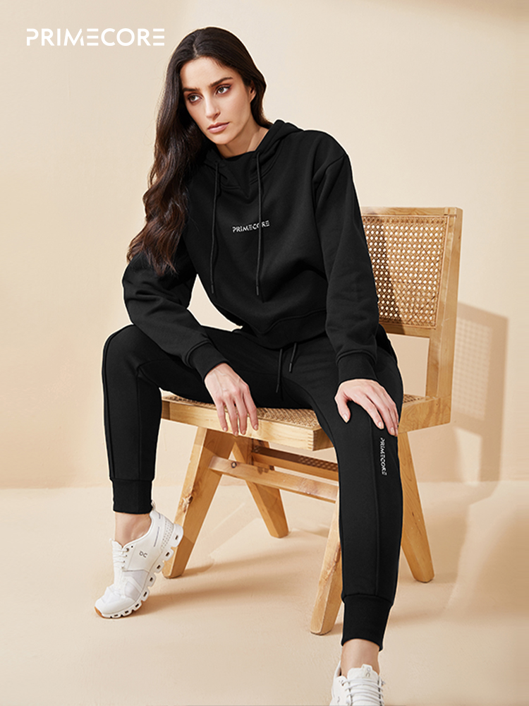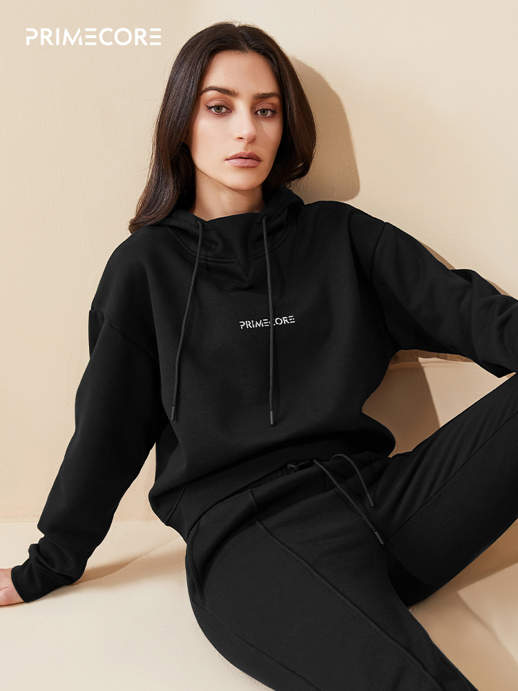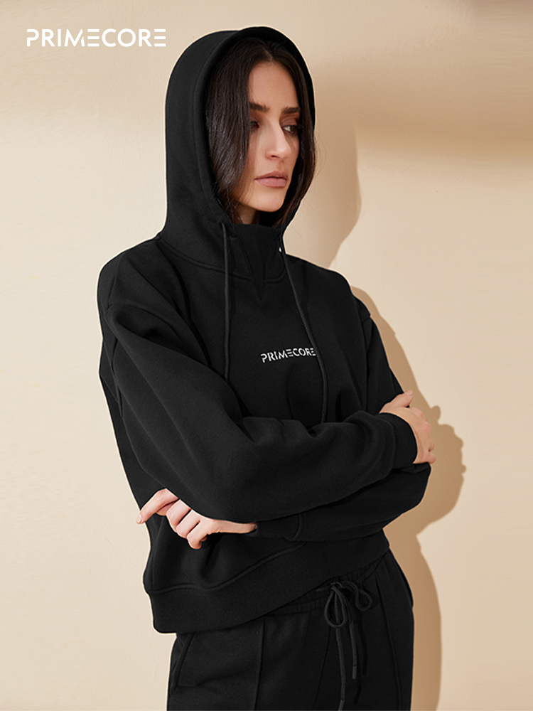 PRIMECORE秋冬长袖 运动卫衣女 套头连帽卫衣黑色短款