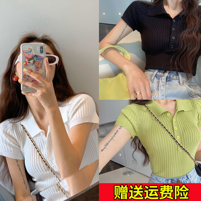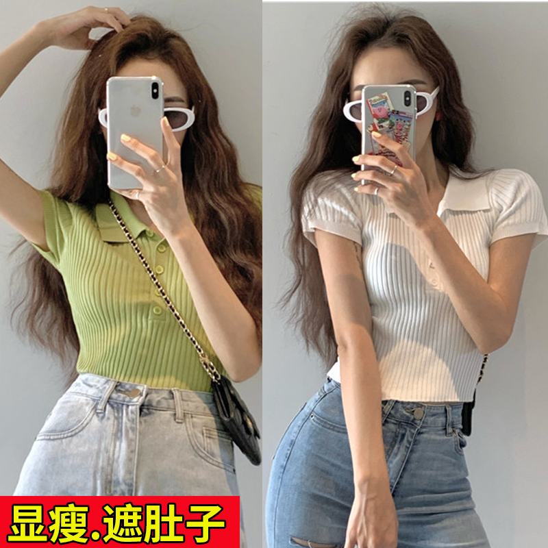 针织短款 大码 胖mm200斤冰丝薄款 t恤女夏季 紧身上衣体恤 POLO领短袖