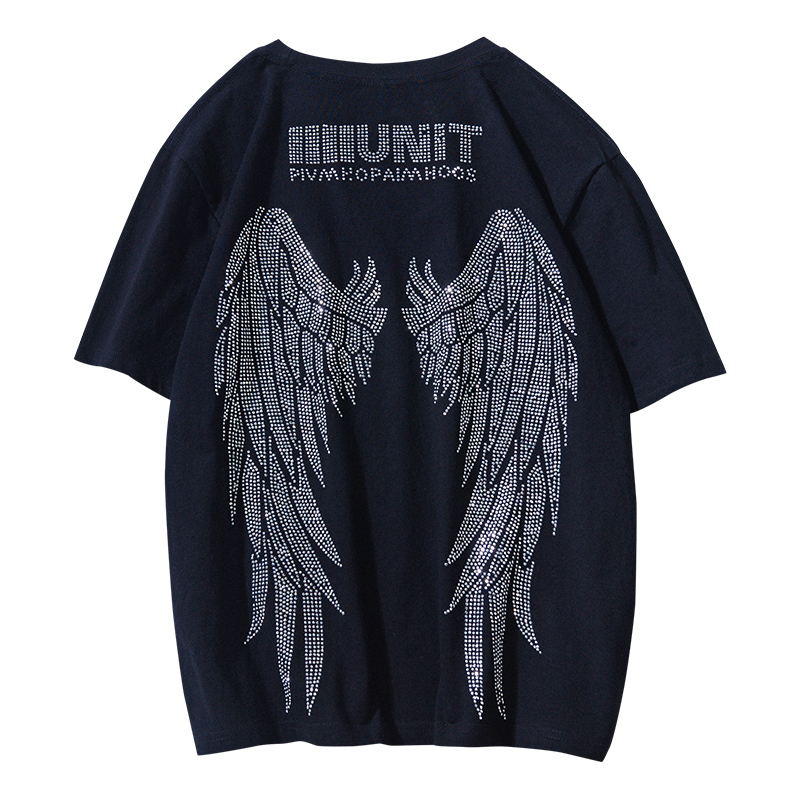 夏季 男女潮宽松高街情侣圆领T恤 欧美街头嘻哈重工烫钻大翅膀短袖