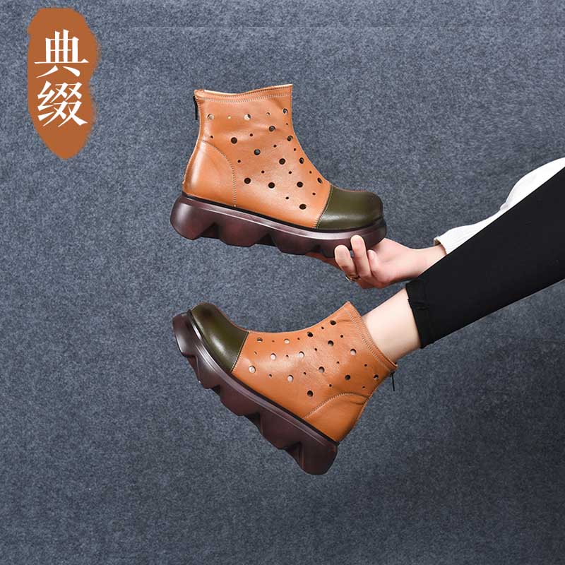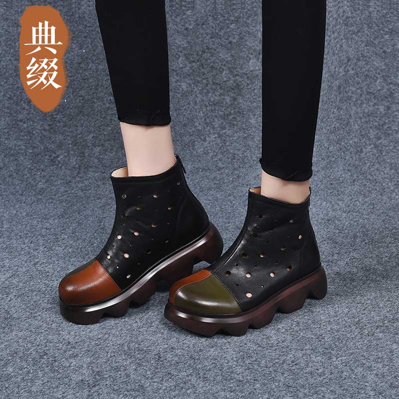 凉鞋 凉靴女牛皮软底高跟镂空马丁靴2025新款 民族风单靴厚底洞洞鞋