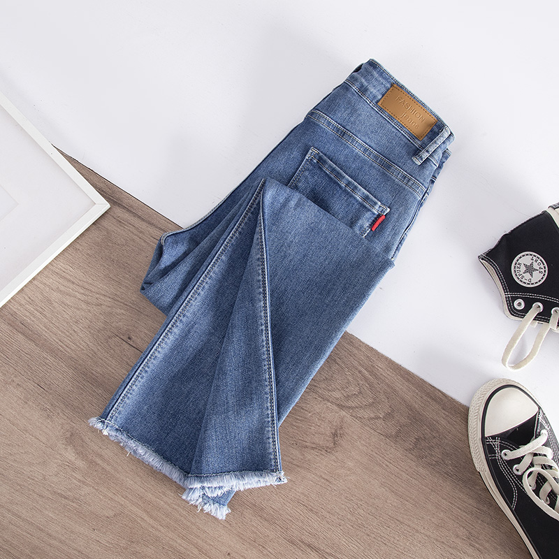 长裤 新款 小个子毛边九分烟管裤 子女春秋蓝色直筒裤 高腰牛仔裤