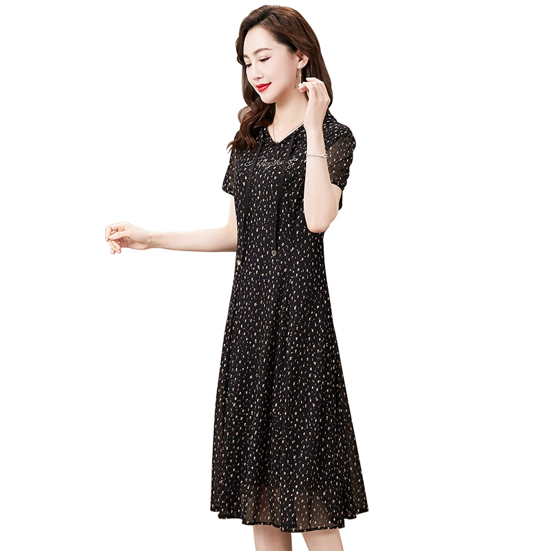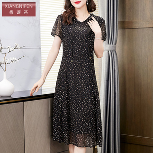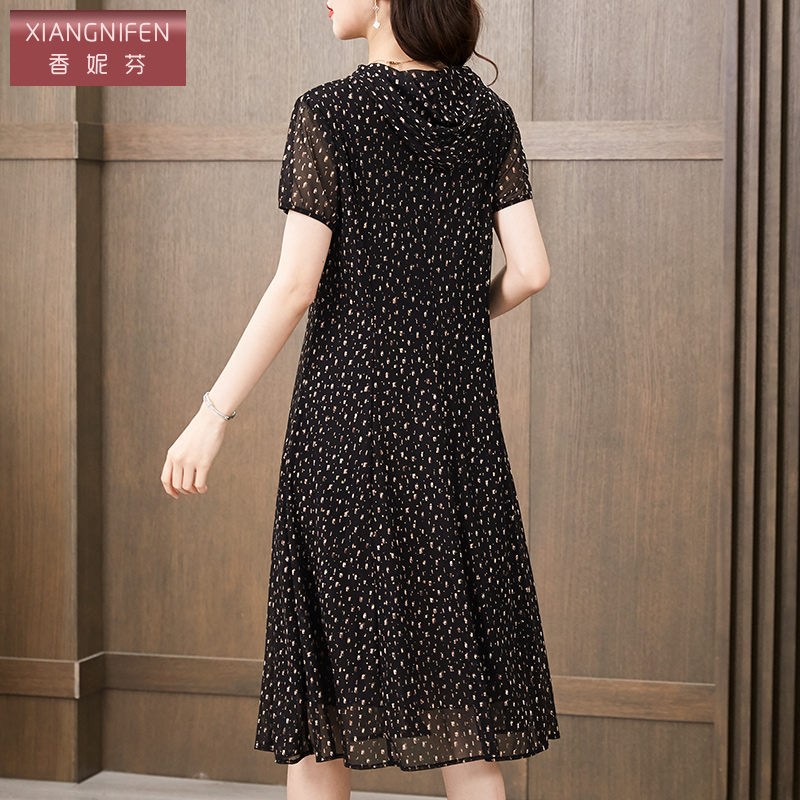 气质年轻妈妈装 香妮芬黑色印花连帽台湾纱连衣裙女夏2025新款 时尚
